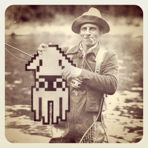 2012-04-12 squid, pixel art, alternate history, photomanipulation, sepia, fishing, pixel