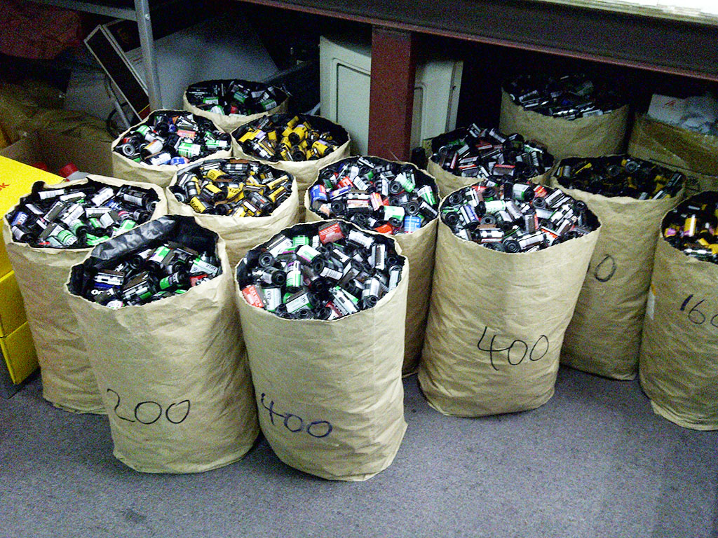 A small fraction of Dot-Well Photo Workshop’s 135 cans for recycling. It’s still possible to be a successful high street lab.