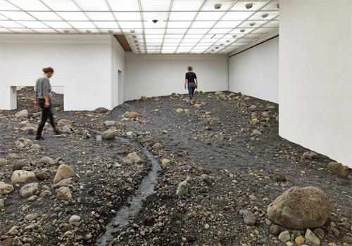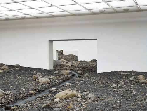 Danish-Icelandic artist Olafur Eliasson, known for his large-scale installations employing elemental materials like light, water, earth, and even atmosphere, transformed an entire wing of Denmark’s Louisiana Museum of Modern Art into a riverbed for his first solo exhibition. The work, which uses rocks, soil, and running water to precisely emulate a natural landscape, stands in stark contrast to the white walls of one of Denmark’s most important Modernist buildings. Originally designed in 1958 by architects Jørgen Bo and Wilhlem Wohlert, the Louisiana’s staggered, irregularly sized portals create an experience that highlights movement through space. By filling the Louisiana with a landscape its galleries might have replaced, Eliasson heightens the haptic qualities of this experience and points to the reality of the museum as an institution and a physical locality. The work raises the question of how natural and built environments might intersect, though it is up to the viewer to decide whether this tension is constructive or destructive.