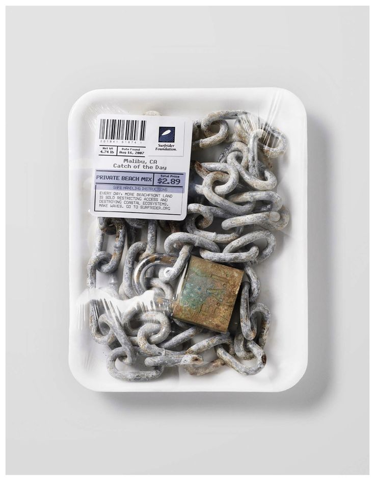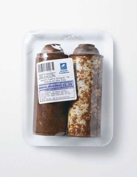 To bring attention to the issue of ocean pollution, the Surfrider Foundation teamed up with advertising agency Saatchi & Saatchi LA to create the “Catch of the Day” campaign. Actual trash collected from beaches around the U.S. was re-packaged as food and left on display at farmer’s markets to create a impactful, site-specific message. By addressing consumers at the point of purchase, the “Catch of the Day” reminds seafood buyers that ocean pollution isn’t someone else’s problem; rather, it impacts individuals on a daily basis. Some of the repackaged items include cigarette butts from Venice Beach, California; aerosol cans from South Padre Beach, Texas; and condoms from Newport Beach, California. While environmental campaigns often emphasize shock value above all else, the Surfrider project tempers startling subjects with a restrained presentation and refined target audience.