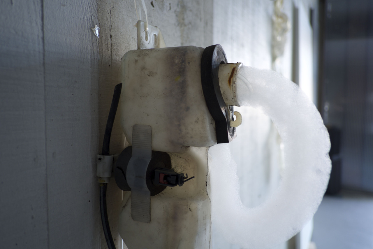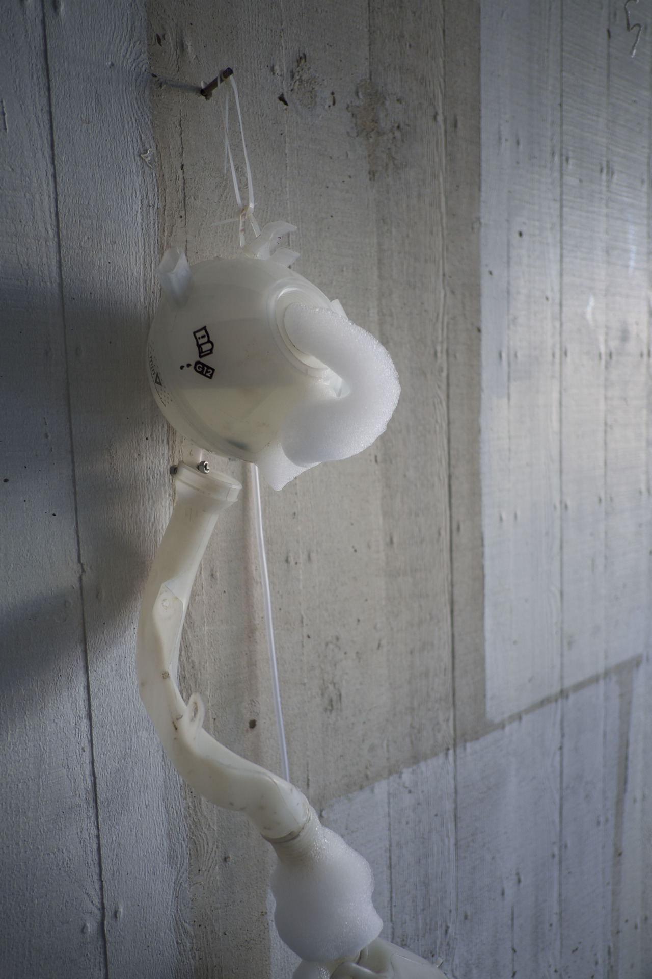 Roger Hiorns’Untitledsculptures are a gathering of bodies hanging from the ceiling that produce a never-ending stream of foam out of thin air. The sculptures contain ordinary bath foam, and air is generated from a small network of air compressors. Over time, pillars of foam slowly rise from the top.
