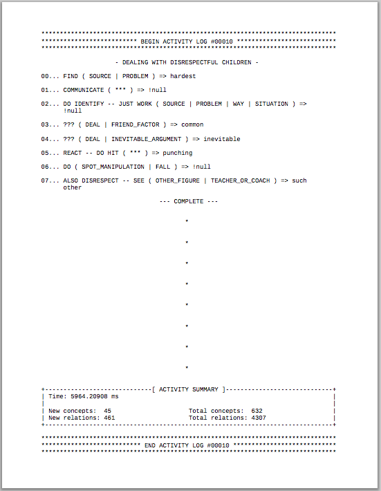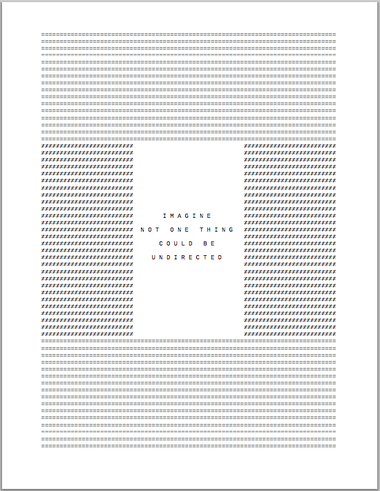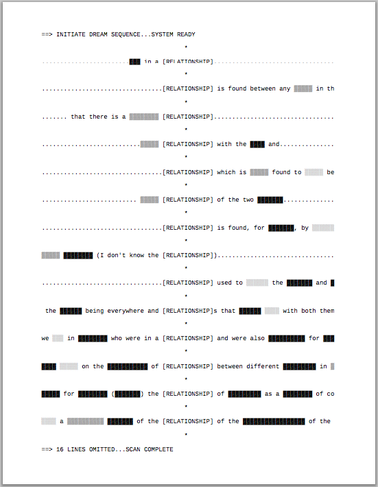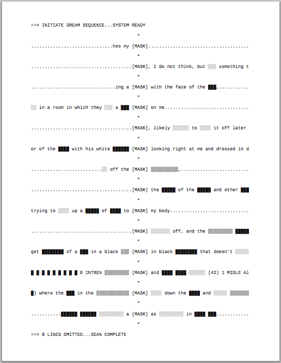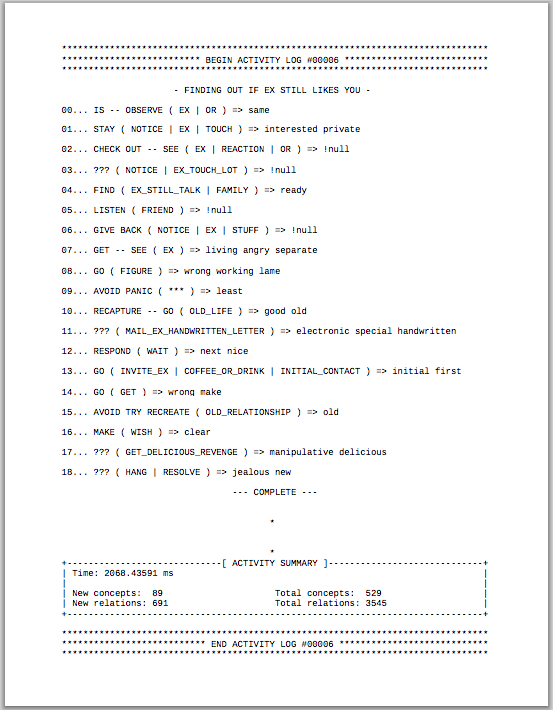 The Seeker is a project by Thricedotted submitted to NanoGenMo, the yearly event of generating a novel with code. This submission is more than the generated novel, as Thricedotted hints, it is “at once an algorithm, an agent, a protagonist, a narrator.” The process parses text from WikiHow, deconstructing it and outputting written and visual ‘logs’ enriched with ASCII aesthetics. It operates in three modes Work, Scan, and Imagine. In Worksmode, it scrapes concepts about human activities. In Scan mode, it searches plain text “memories” from a seed concept encountered during Work. It then uses the concepts it didn’t recognize from Scan mode (censored out in its logs) to Imagine an “unvision” around the seed concept. The code and documentation is available on github.