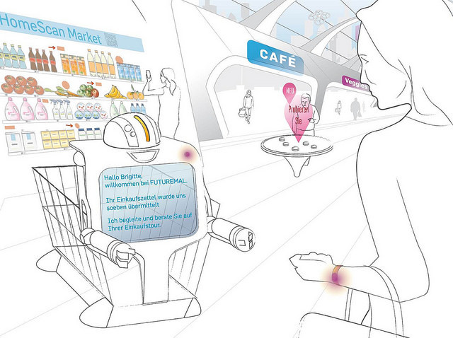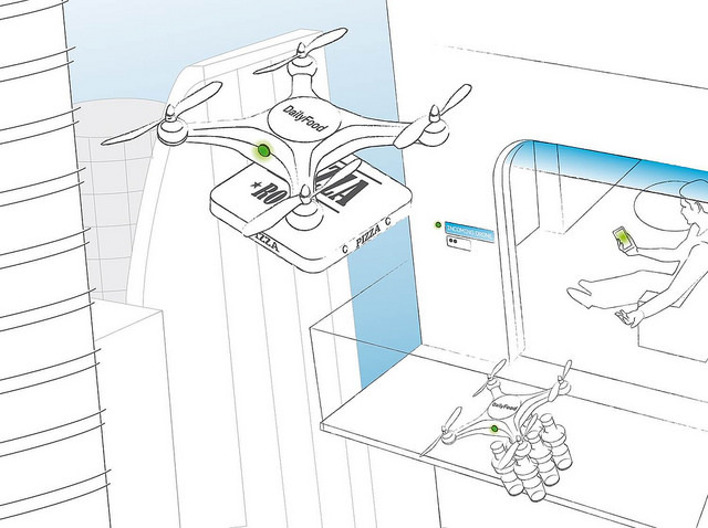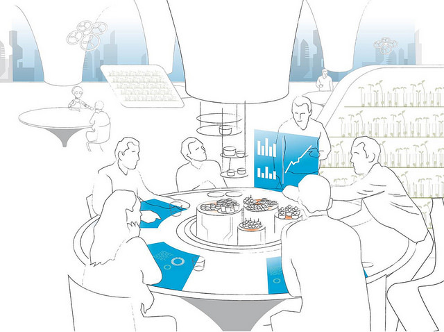 So why the fuss? Have a look at the illustrations, because I’m not sure what happened here. They all look like moodboards for modern sterile-societies in dystopian YA novels or like fast sketches for a new black mirror episode. Of course, they are simple. But drones with a sixpack of beer in urban environments (imagine 8kg flying 10 feet above your head) for the sake of convenience? Autonomous service shopping carts as representatives of reflected consumption in a responsible society? Dinner with friends at work with number crunching holo-statistics?