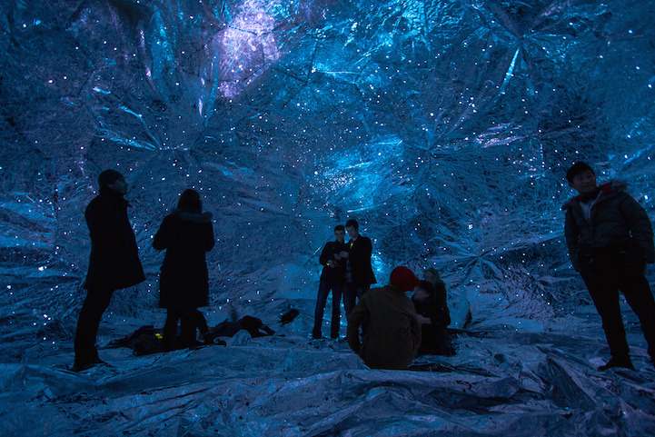 The project featured a pneumatically-inflated cocoon fashioned from silver mylar, and its viewers could pass through the zip-up entrance and sit beneath the stars in a brilliant, all-encompassing setting.