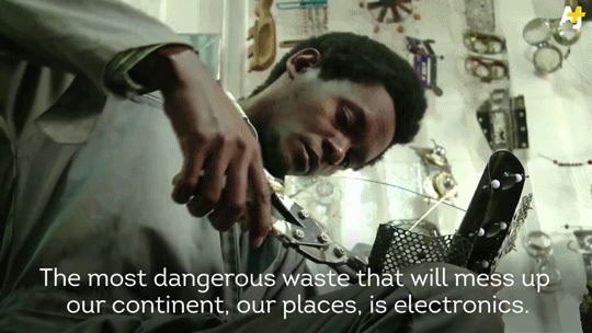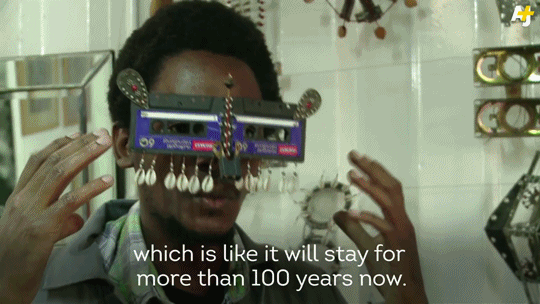 Video short from AJ+ interviews Nairobi artist Cyrus Kabiru who creates wearable art from electronic waste: