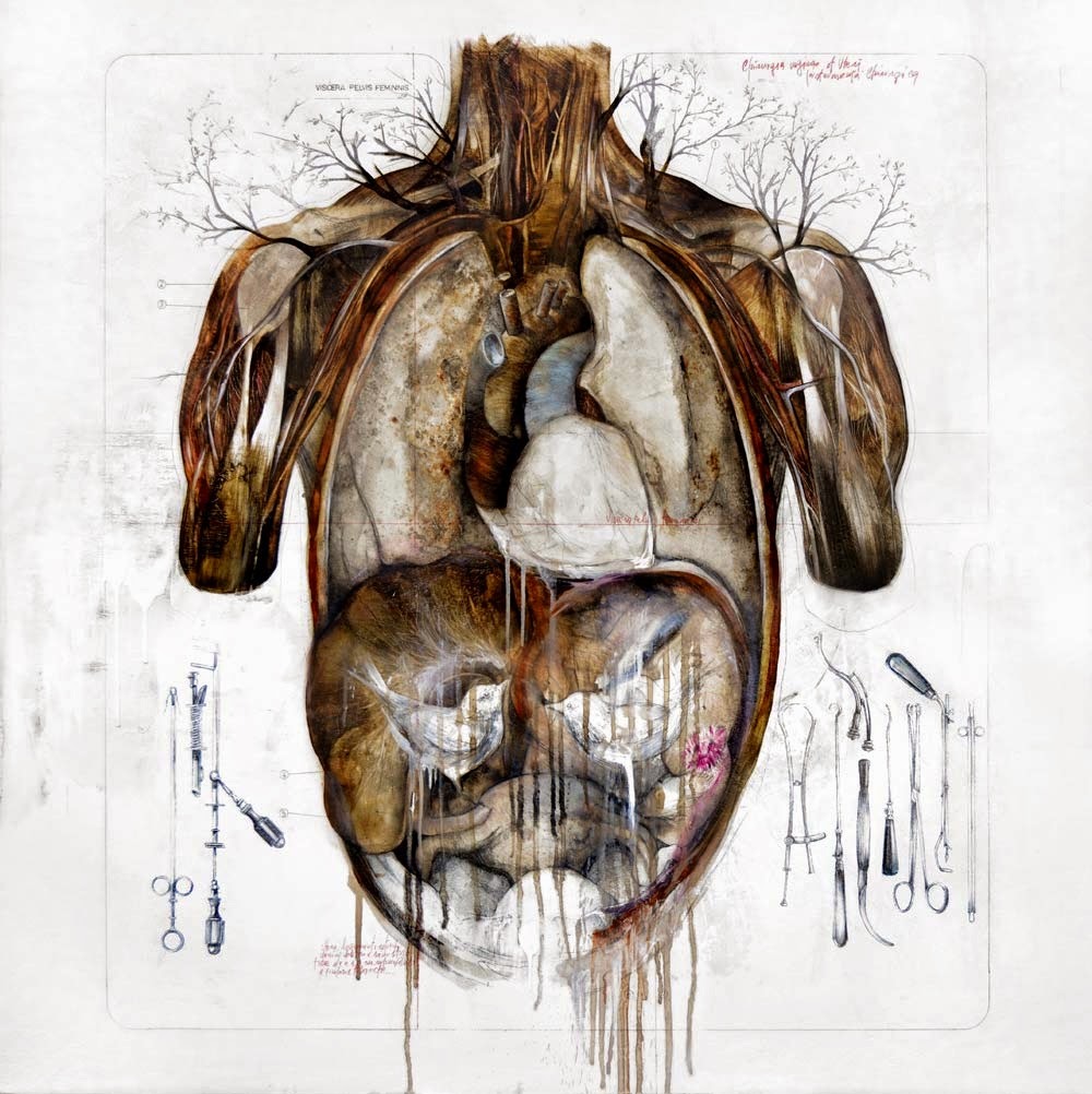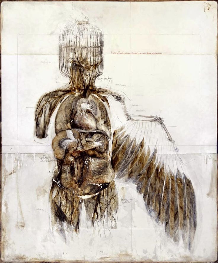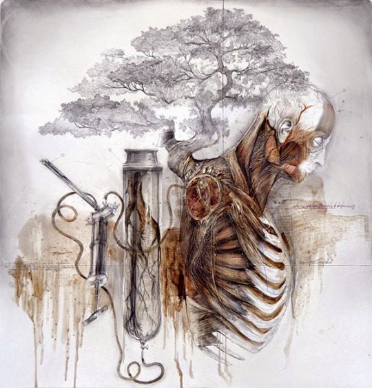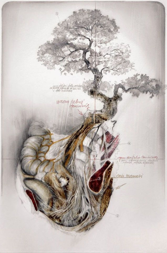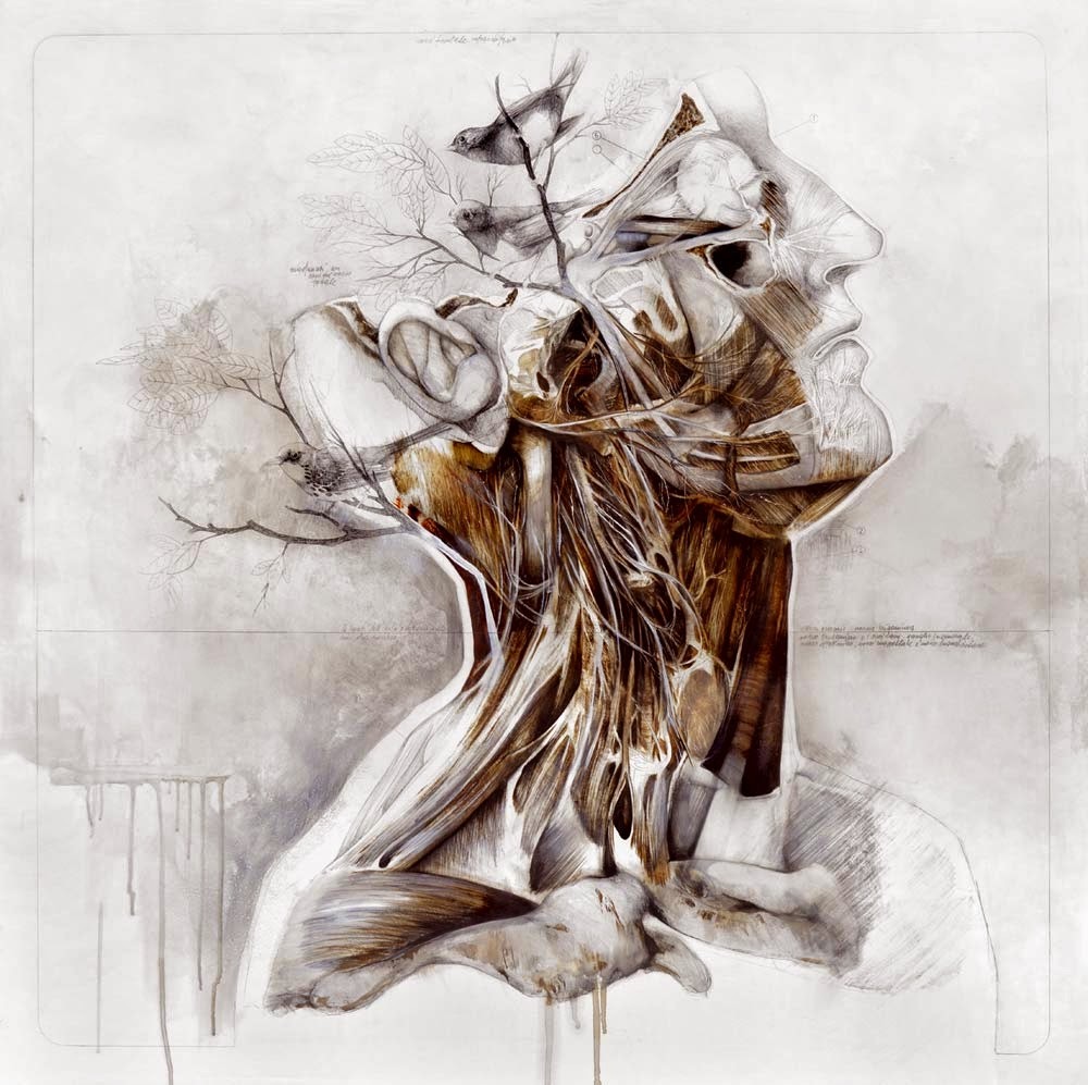 Italian artist Nunzio Paci explores the union between humanity and nature. By inserting illustrations of natural elements, such as twigs and birds and surgical tools, he creates a cohesive, surreal piece which serves as a sketchbook with pencil and oil. By meticulously adding glimpses of the muscular and skeletal structures of the human body, Paci’s purpose is to create a balance between life’s most innermost primal nature and balance. The artist also uses the heart as his most common subject to showcase the wildness and ardent quality of the human heart by placing roots to demonstrate the largest source of life in the human anatomy. Paci explains: