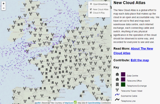 The New Cloud Atlas is a global effort to map each data place that makes up the cloud in an open and accountable way. We have set out to find and map each warehouse data centre, each internet exchange, each connecting cable and switch. Anything of any physical significance in the operation of the cloud should be observed is some way, and recorded for everyone to see and use.