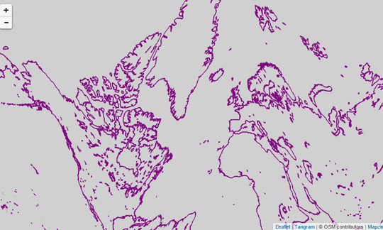 Like most web mapping services, our Tangram library draws maps in the “Web Mercator” projection. This projection has its benefits, but it’s certainly quirky. Mercator projections are well-known for their distortion at high latitudes—this is because they place the north and south poles at positive and negative infinity, which means a Mercator map of the whole world would be infinitely tall.