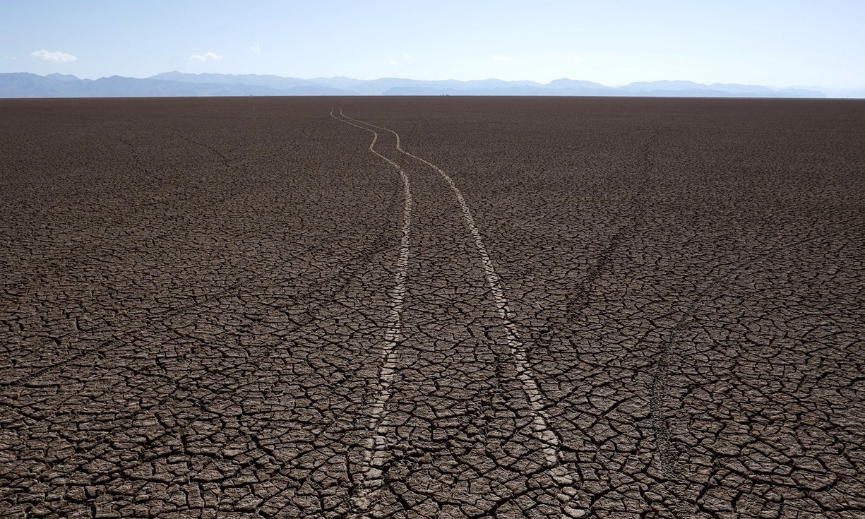 Bottom: Tyre tracks and the carcass of a bird on the now parched ground of the lake bed.