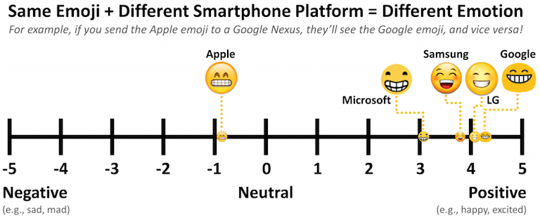 Hey emoji users: Did you know that when you send your friend Google’s grinning face with smiling eyes emoji on your Nexus, they might see Apple’s grinning face with smiling eyes emoji on their iPhone? And it’s not just Google’s grinning face with smiling eyes emoji; this type of thing can happen for all emoji (yes, even pile of poo emoji). In a paper (download) that will be officially published at AAAI ICWSM in May, we show that this problem can cause people to misinterpret the emotion and the meaning of emoji-based communication, in some cases quite significantly. face screaming in fear emoji, we know.