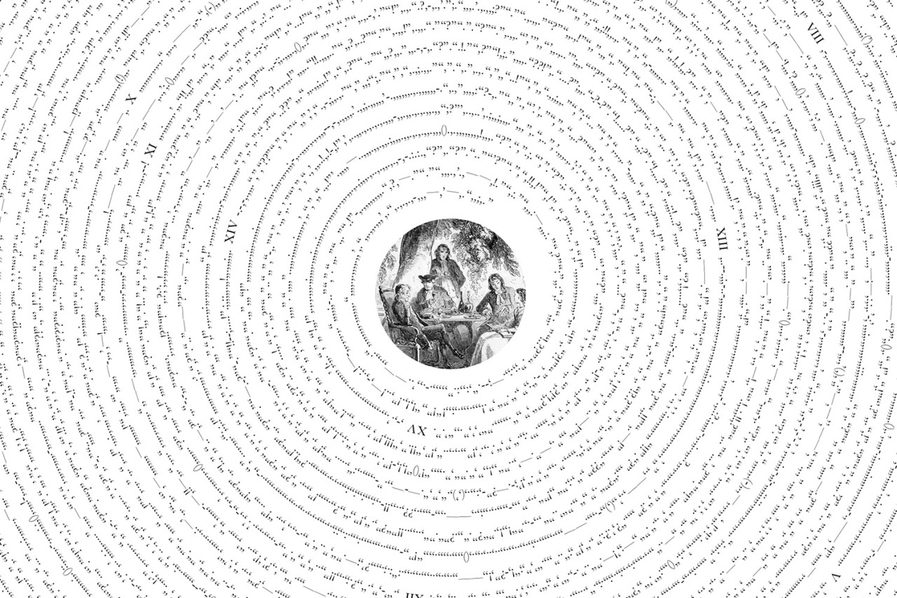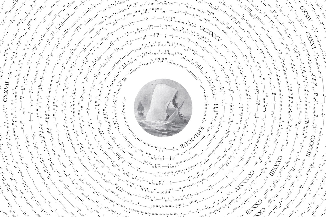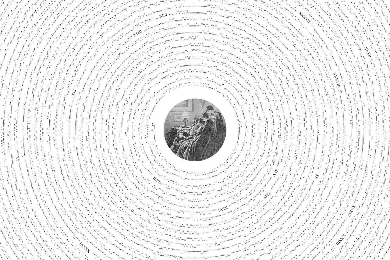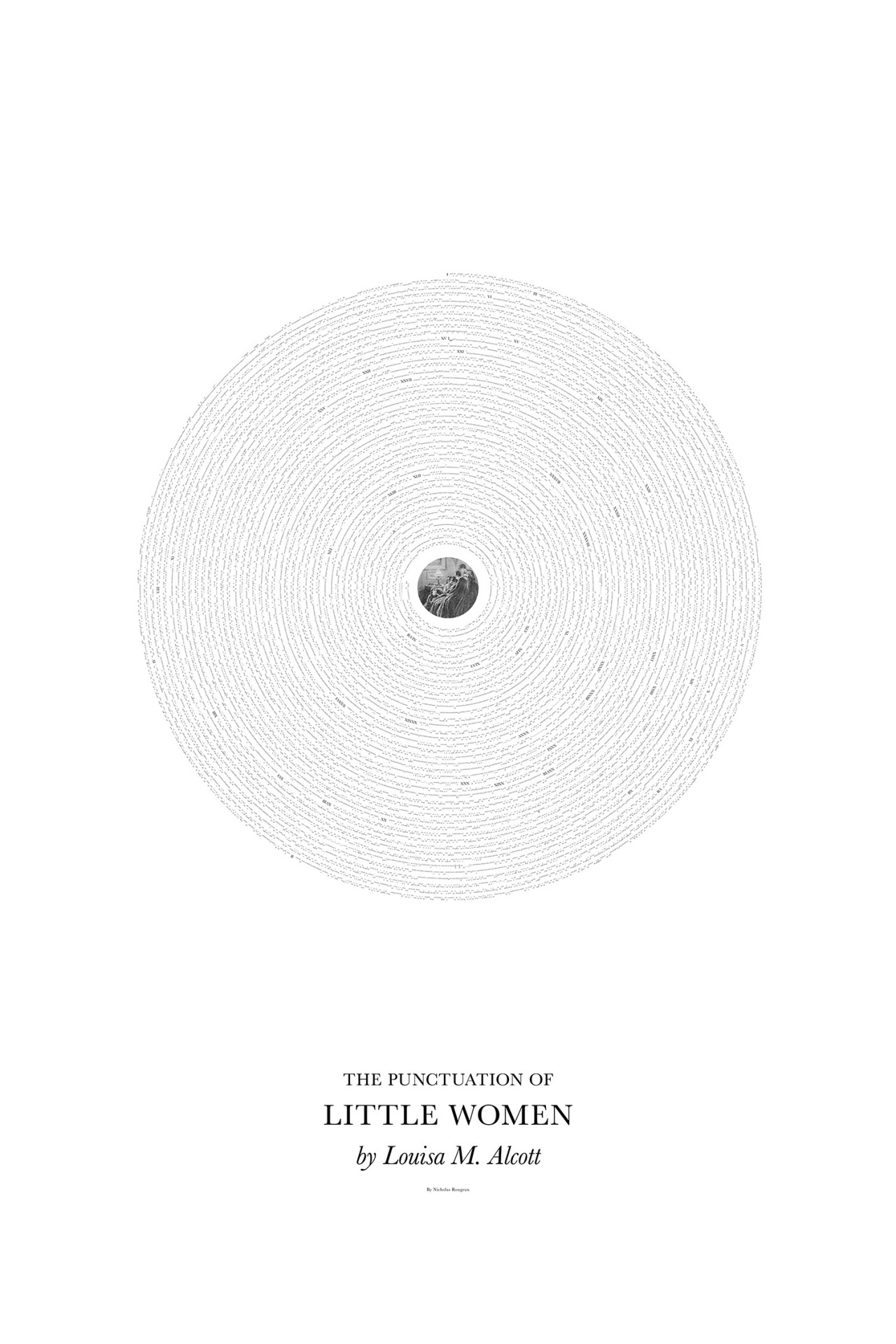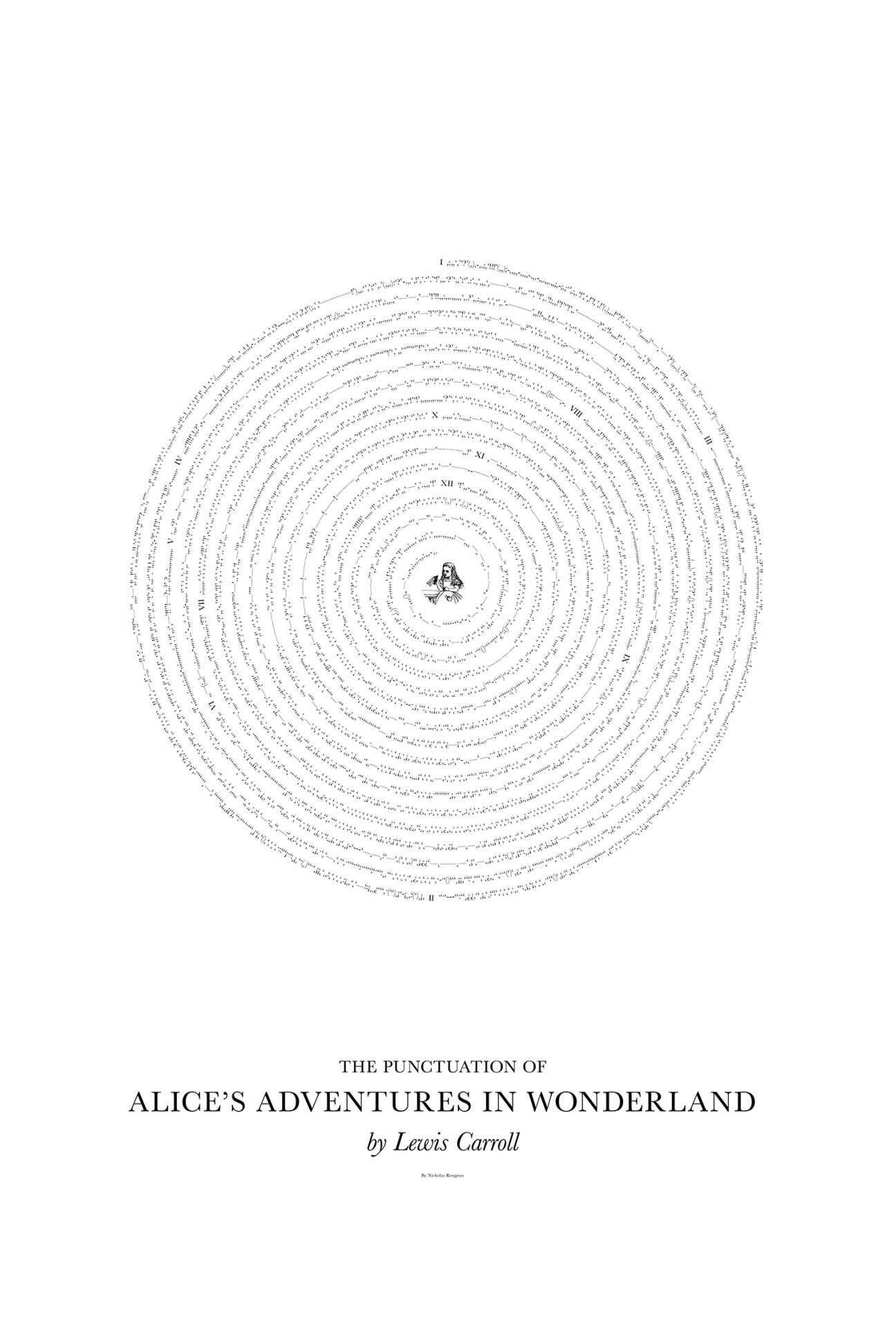 Between the Words is an exploration of visual rhythm of punctuation in well-known literary works. All letters, numbers, spaces, and line breaks were removed from entire texts of classic stories like Alice’s Adventures in Wonderland, Moby Dick, and Pride and Prejudice—leaving only the punctuation in one continuous line of symbols in the order they appear in texts. The remaining punctuation was arranged in a spiral starting at the top center with markings for each chapter and classic illustrations at the center.All literature used is in the public domain and most was retrieved from Project Gutenberg. Shakespeare’s sonnets are based on the original 1609 publication, scans of which can be found on the Internet Archive.