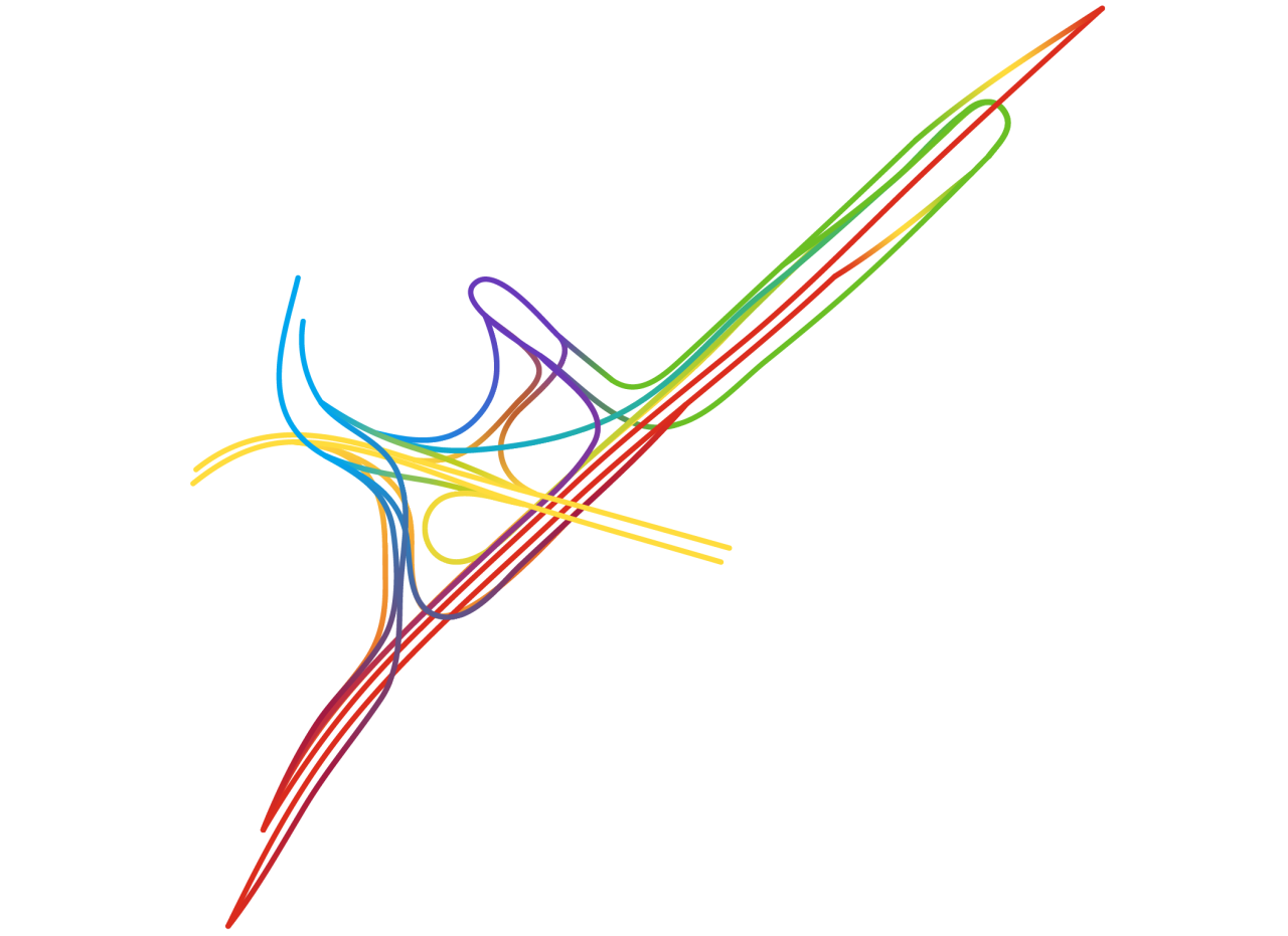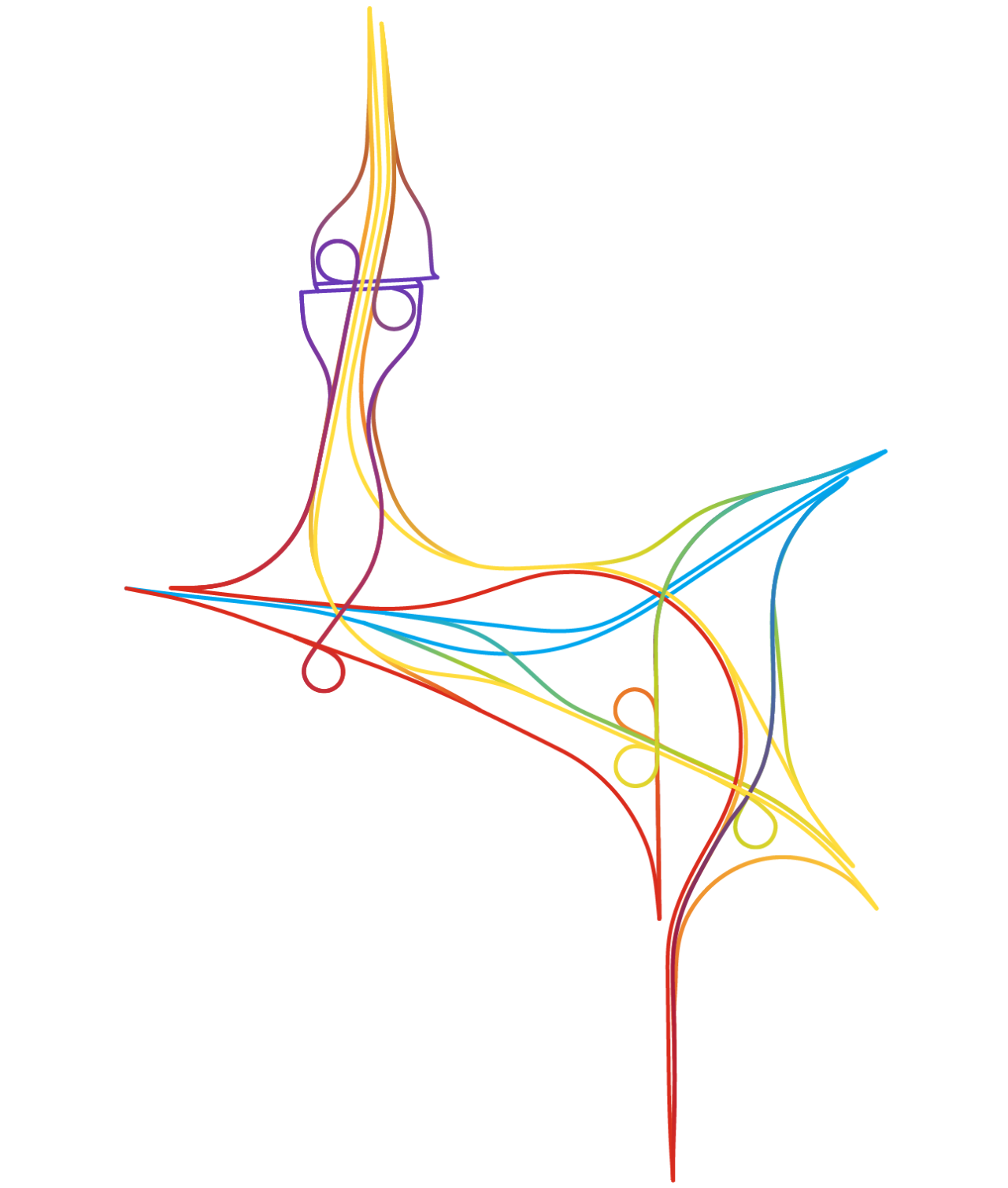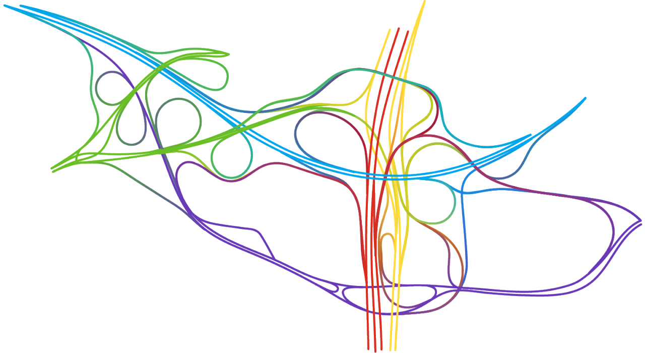Interchange Choreography is a collection of complex interchanges of three or more roads. Hundreds of interchanges have been constructed with only two roads that are just as complex or more so than those with three or more. However, colors look more interesting with three or more roads so only those were included. Each line in a diagram was colored and refined manually without the use of code or other automation. Satellite photos of these and many more interchanges are available in the earlier Road Knots project.