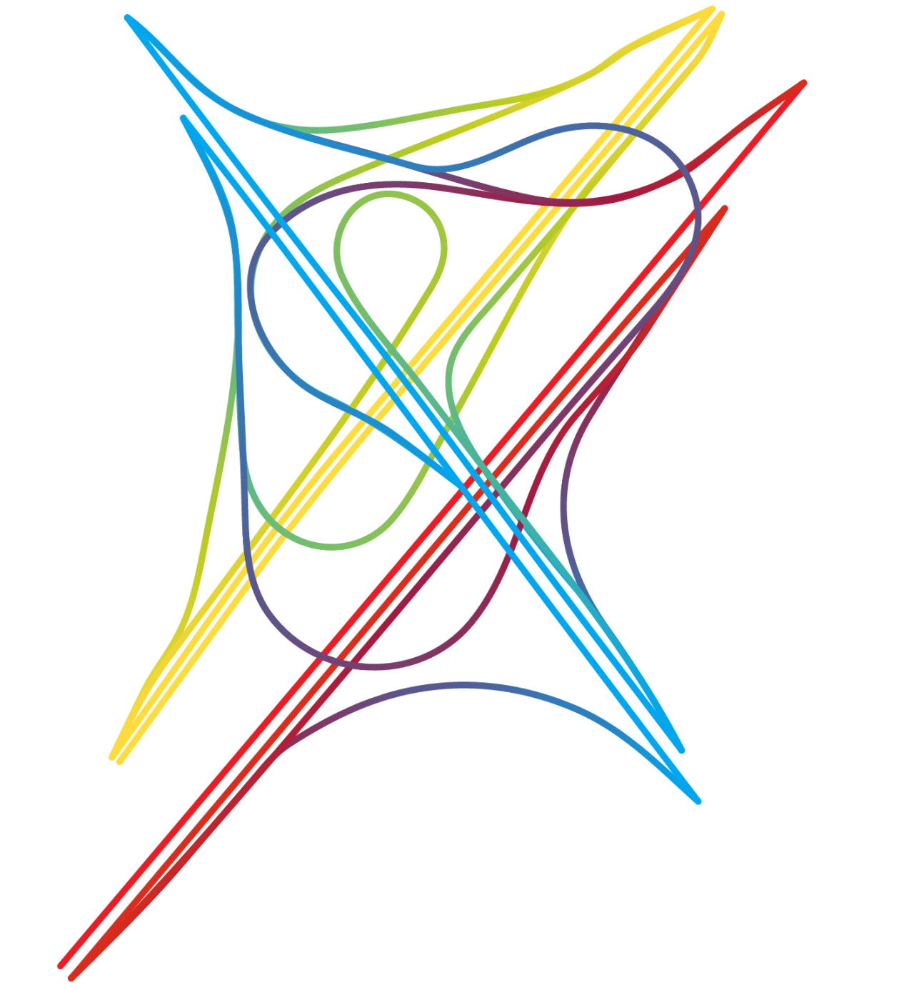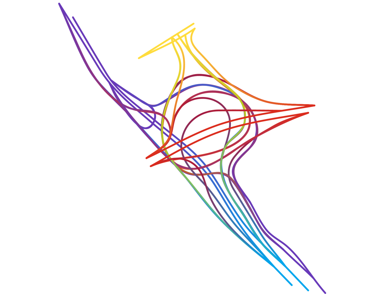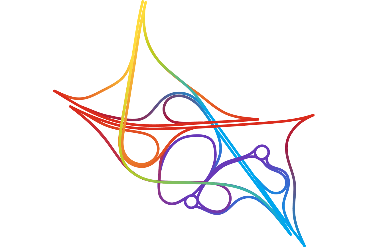 Interchange Choreography is a collection of complex interchanges of three or more roads. Hundreds of interchanges have been constructed with only two roads that are just as complex or more so than those with three or more. However, colors look more interesting with three or more roads so only those were included. Each line in a diagram was colored and refined manually without the use of code or other automation. Satellite photos of these and many more interchanges are available in the earlier Road Knots project.