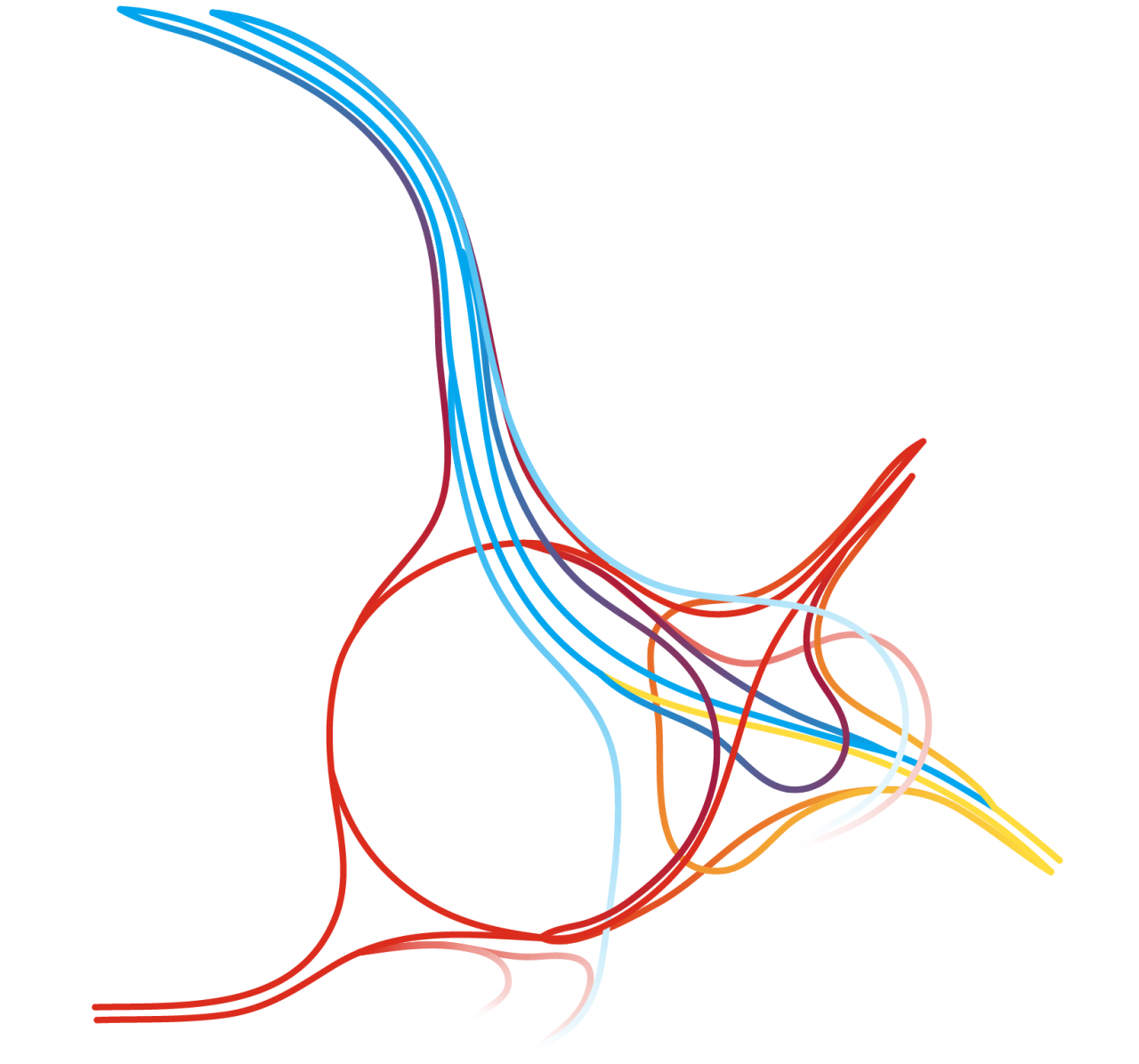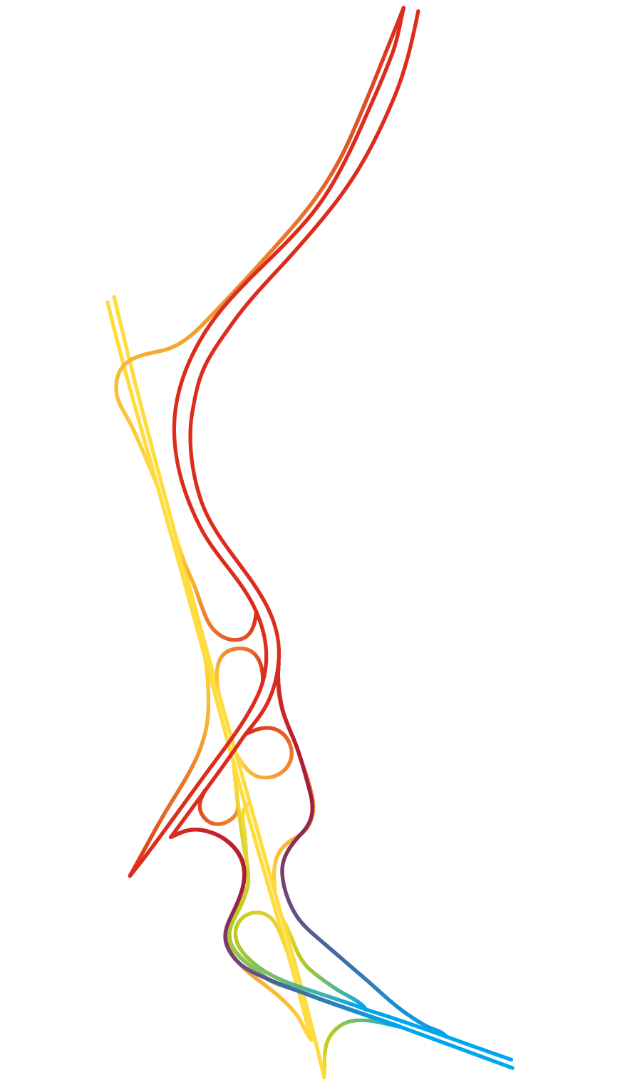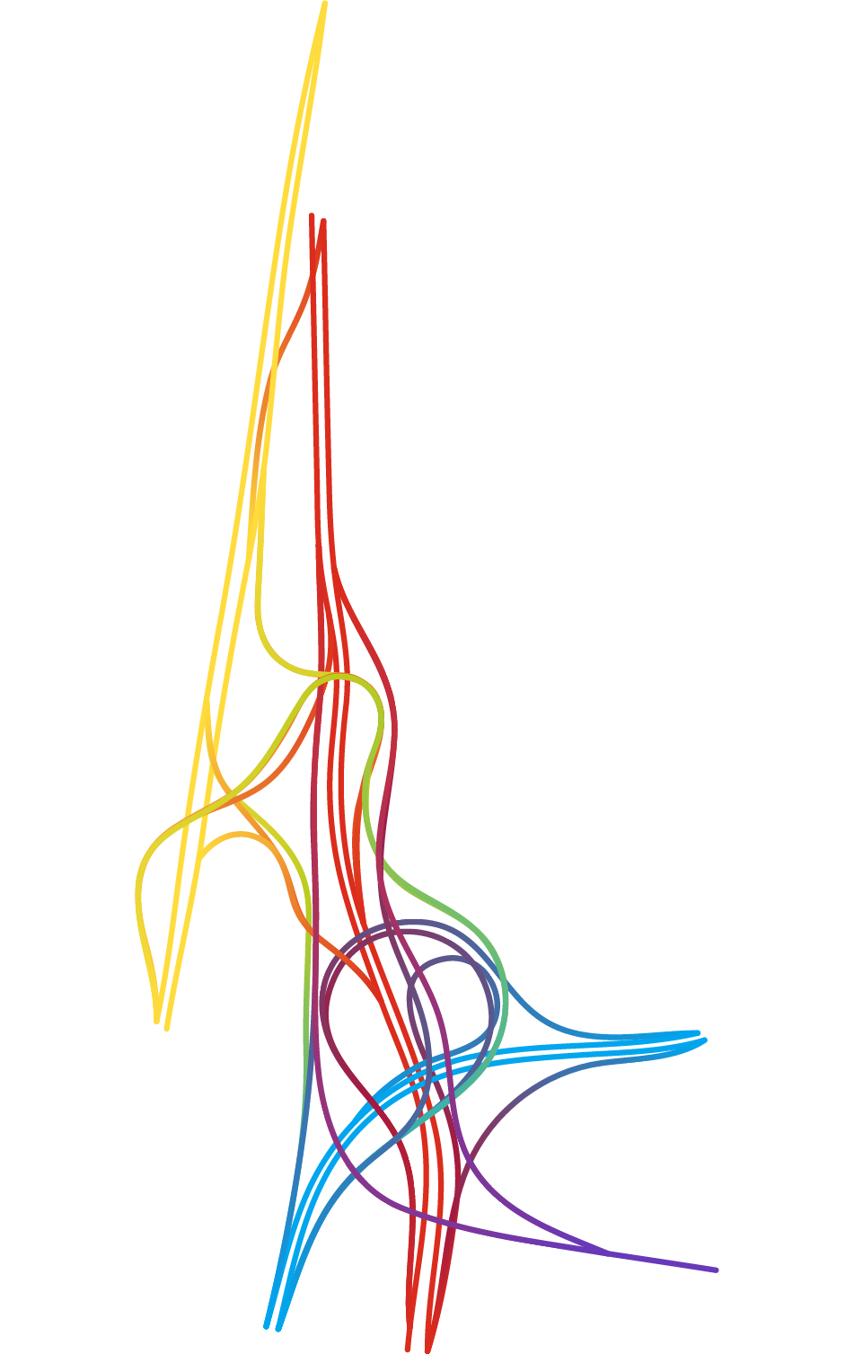Intersections of major roads have been given nicknames like “mixing bowl,” “spaghetti junction,” and “knot”—invoking images of tangled messes (and rightly so), but there’s beauty in the chaos. Applying colors to roads and using connecting roads to blend those colors adds structure and breathes new life in to areas that are often avoided for their complexity. The results resemble everything from dancers to otherworldly creatures.