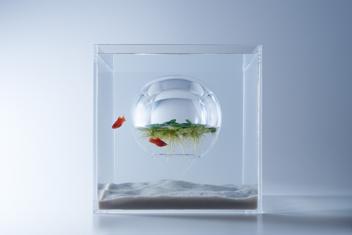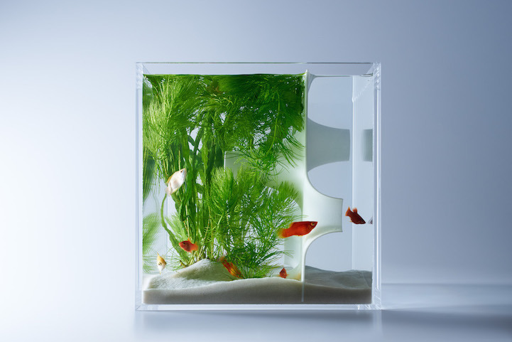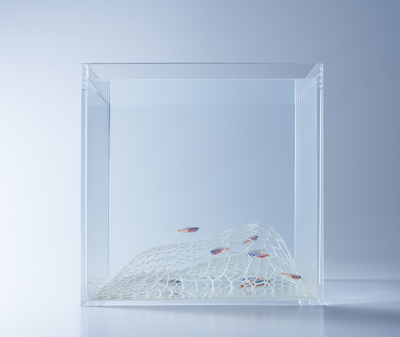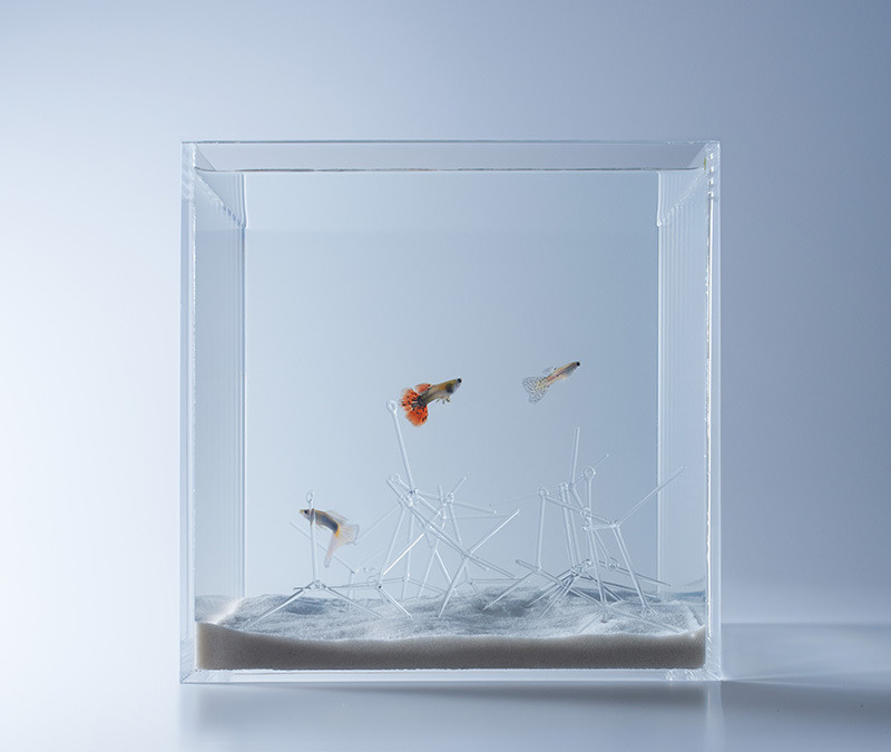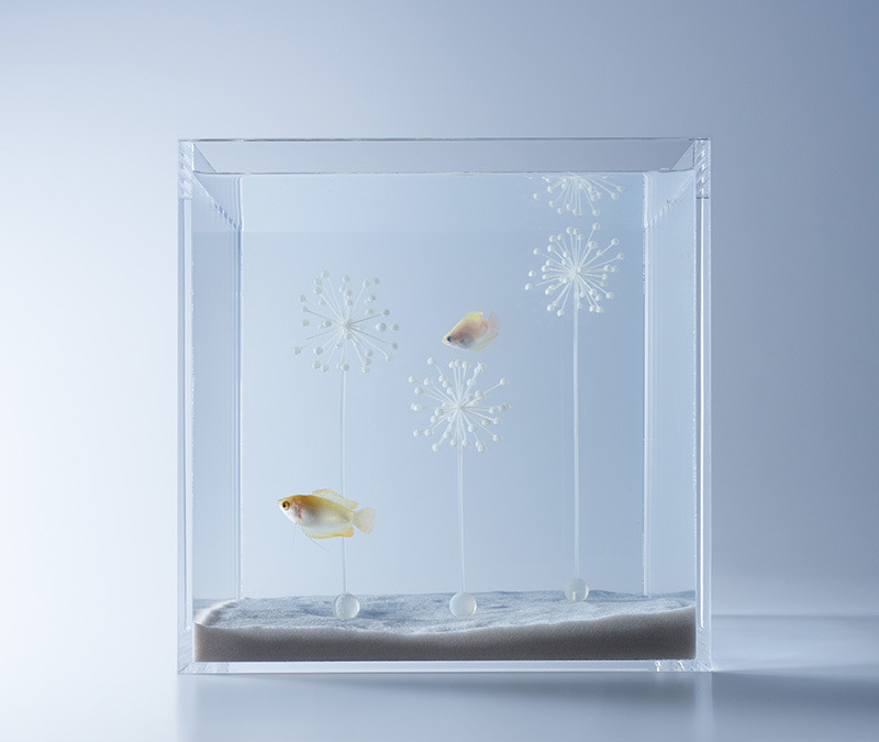 The inner space of this fish tank is created by combining two simple elements of container and water, with an extraordinary world created that differs from the world with air…structures that are prone to damage caused by their own weight on land are able to maintain a stable state because of the relative force of gravity and buoyancy.