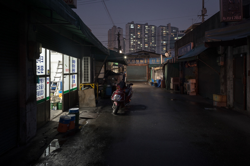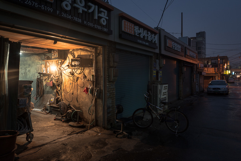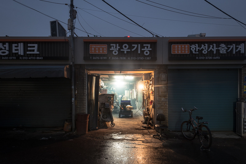 Walking through the nights in Mullae district in Seoul, South Korea, Berlin-based photographer Christopher Domakis captured these haunting images of this well known as an urban art district. In between the many metal workshops you’ll find more and more ateliers and galleries, small restaurants and cafes as well. We have previously featured the photo sets Microcosm and The Minimalist (Berlin Public Library) by this artist.