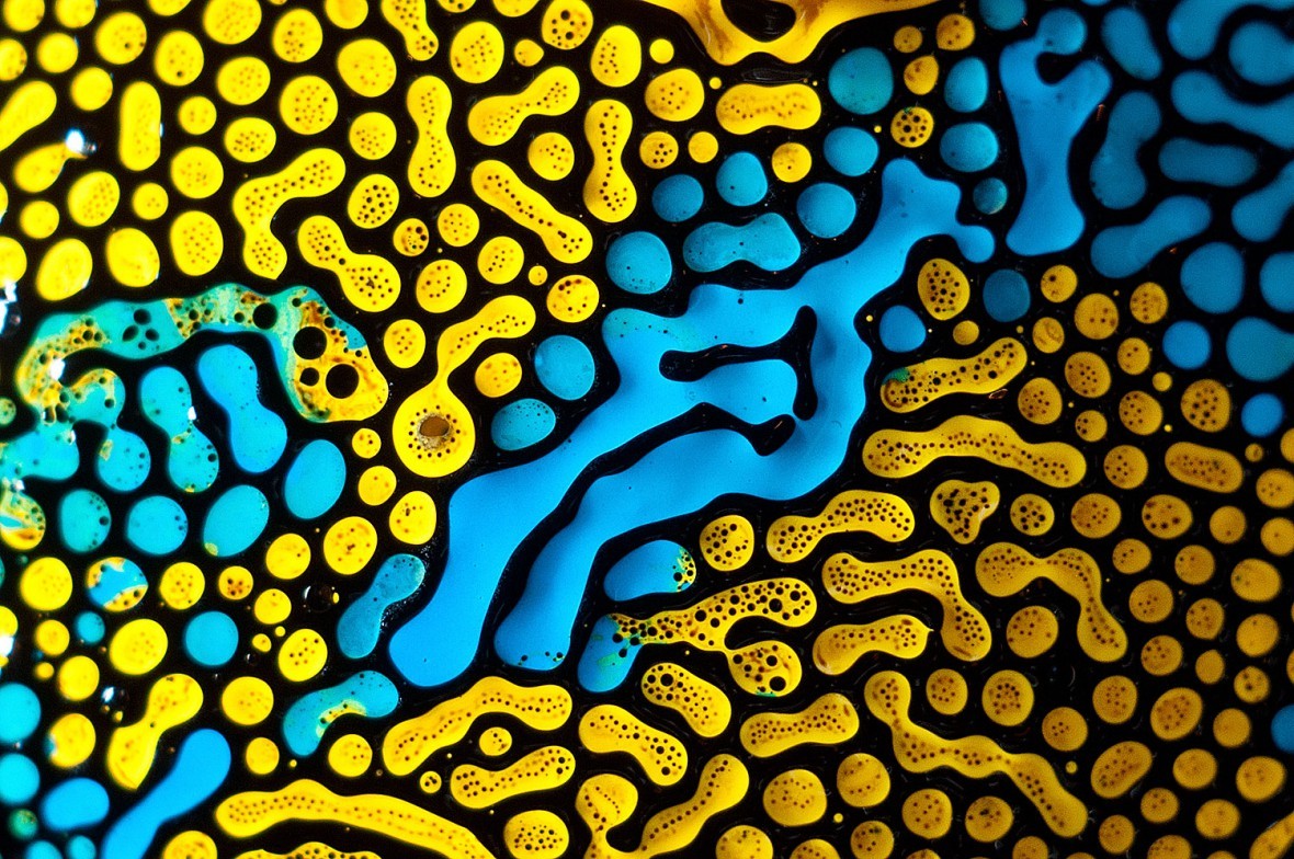 The shapes you see in these image are only about the size of a thumbnail. They are created with the aid of a very peculiar material: ferrofluid. This liquid has a very unique property. It is magnetic, caused by the millions nano iron particles in it. When put under a magnetic field, the particles in the solution start to rearrange due to the attraction and repulsion of iron. If now water colors are added to the ferrofluid, the pop-art looking structures start to appear, forming into black channels and tiny ponds filled with rainbow colored surfaces. The reason why the black ferrofluid and the water colors don’t mix is that ferrofluid is, just like oil, hydrophobic. It therefore doesn’t mix with the water colors. At the same time it is held in position by the magnet underneath it. So it tries to find a way around the water colors and therefore forms these black channels.