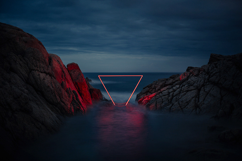rivals’ ‘la línea roja’ is conceived as a journey through spain, one that seeks to connect man and nature. the images are not digital compositions, nor 3D post-production works, but rather the result of physical installations in nature at night, captured with long exposure photographic techniques. indifferent to symmetry, the glowing forms mysteriously intersect the surrounding landscape and eerily illuminate areas of thick brush that would otherwise be completely dark. an intensely red ray of light is seen as a triangle, squeezing in between a series of nearby trees; a rectangle, rising vertically from a rocky mountain; and a square, peeking out from beneath the surface of a shallow pool of water.