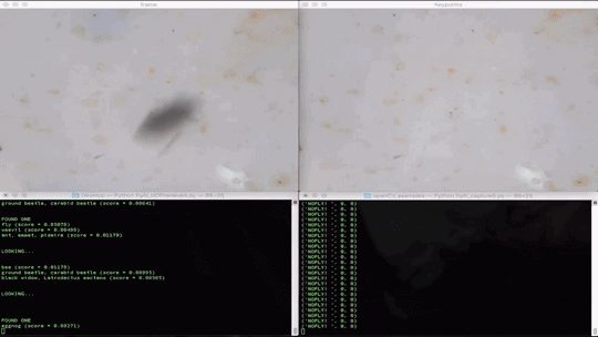 The installation uses the TensorFlow machine learning image recognition library to classify images of live houseflies. As the flies fly and land in front of a camera their image is captured. The captured image is classified by the image recognition software and what the software guesses it is looking at is ranked 1 through 5 and output. Each ranking is assigned a percentage based on how likely the software thinks that this is what it is looking at.