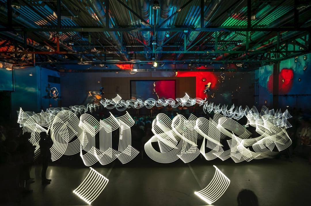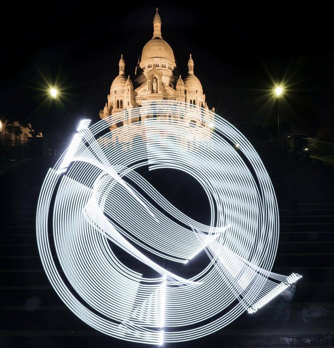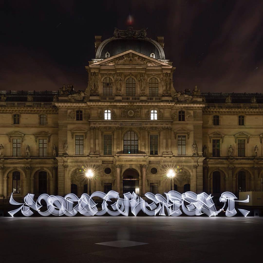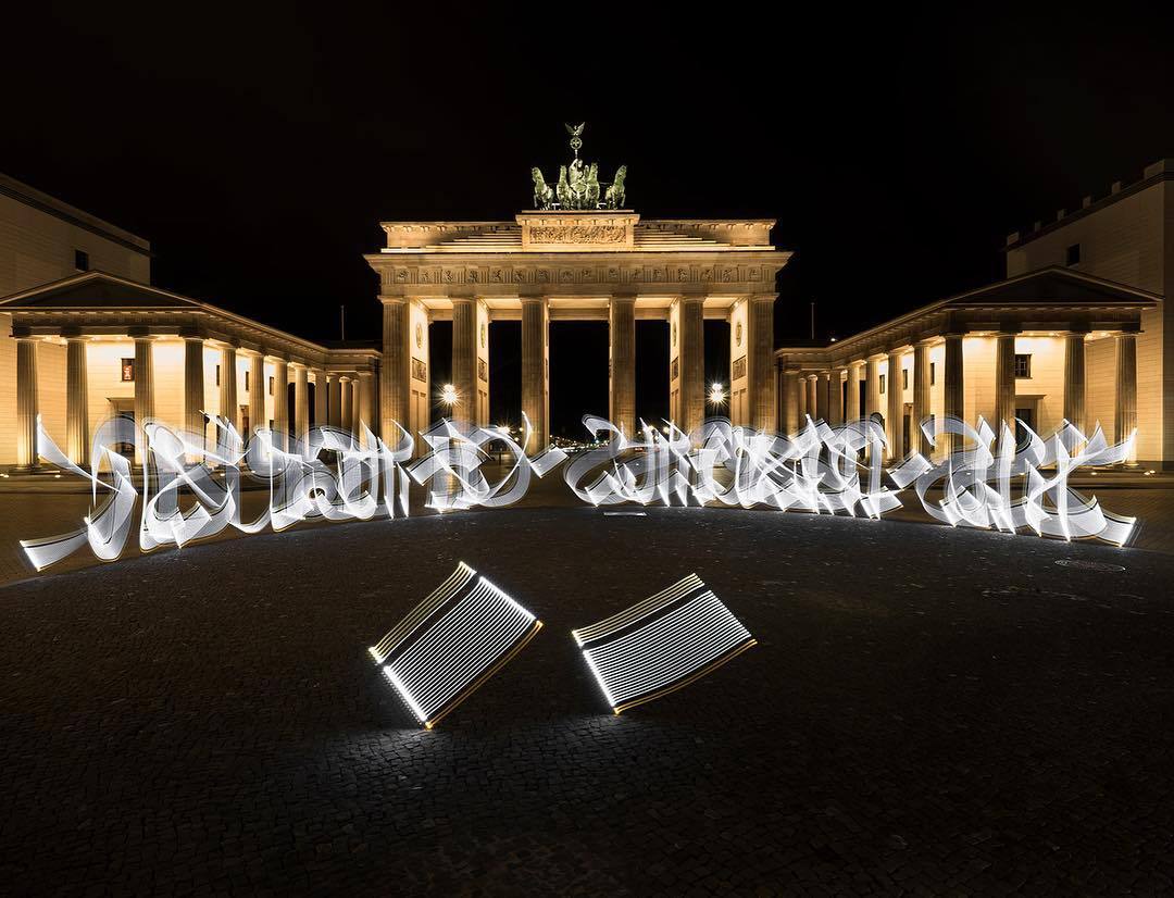 Mexican calligraffiti artist Said Dokinscombines calligraphy writing with graffiti techniques to create public murals that address conflicts of power, destruction, and control imposed by both historic and contemporary regimes. His latest project, Heliographies of Memory, uses luminous tools to explore displaced memory, creating light paintings that use famous historic buildings or other iconic sites as temporary backdrops.