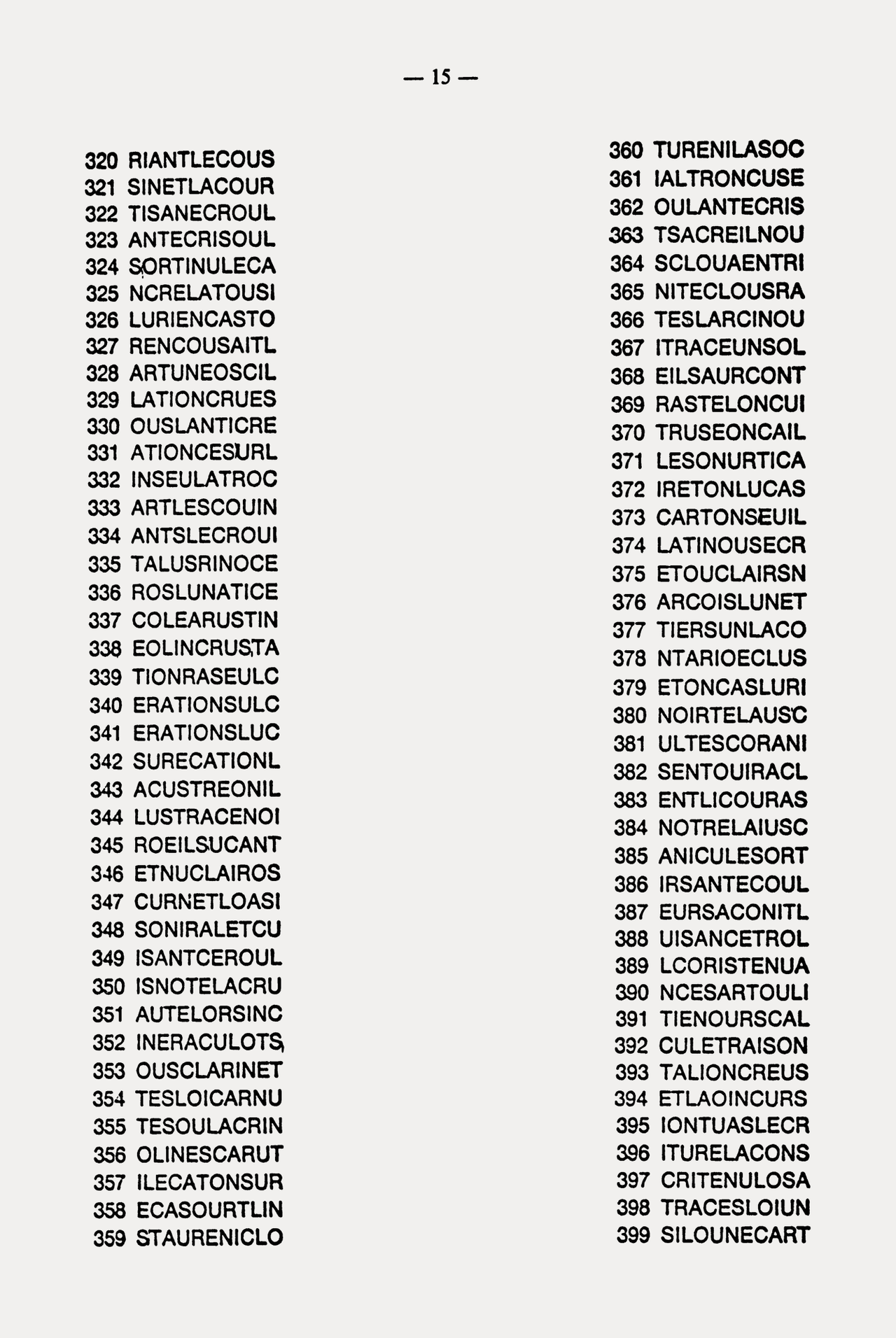 Georges Perec, Ulcérations, La Bibliothèque oulipienne, Volume 1, Paris, 1974; in Oulipo, La Bibliothèque oulipienne, Volume 1, Éditions Ramsay, Paris, 1987, pp. 1-16 (p. 2 and p. 16 are two blank pages) (pt. 2) (pt. 1 here)
