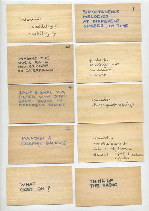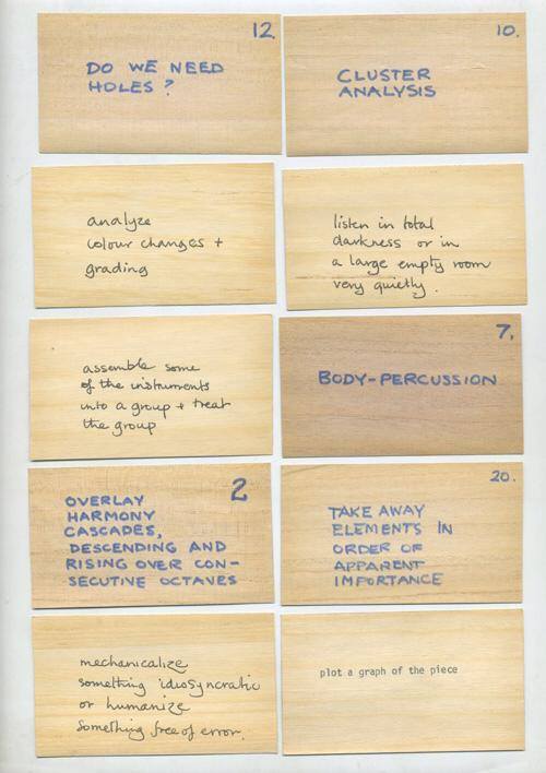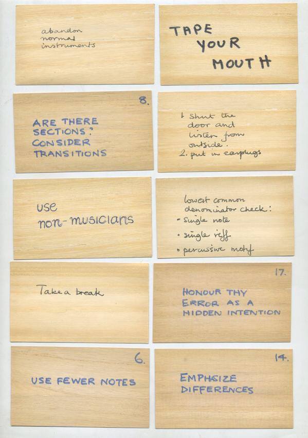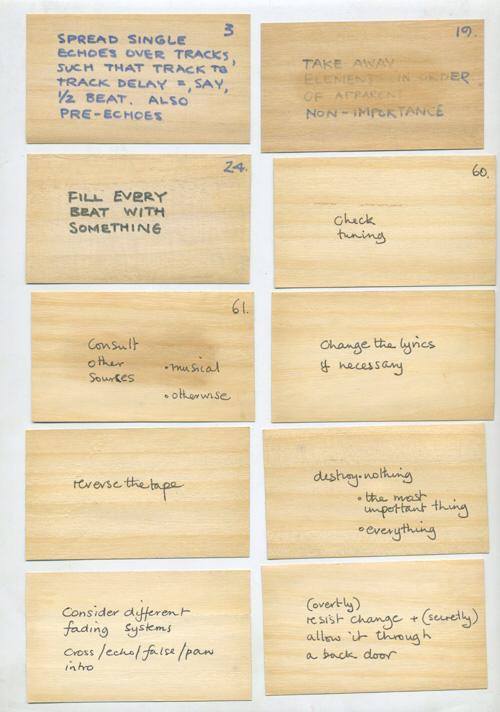 The original hand-written Oblique Strategies by Brian Eno and Peter Schmidt, 1974