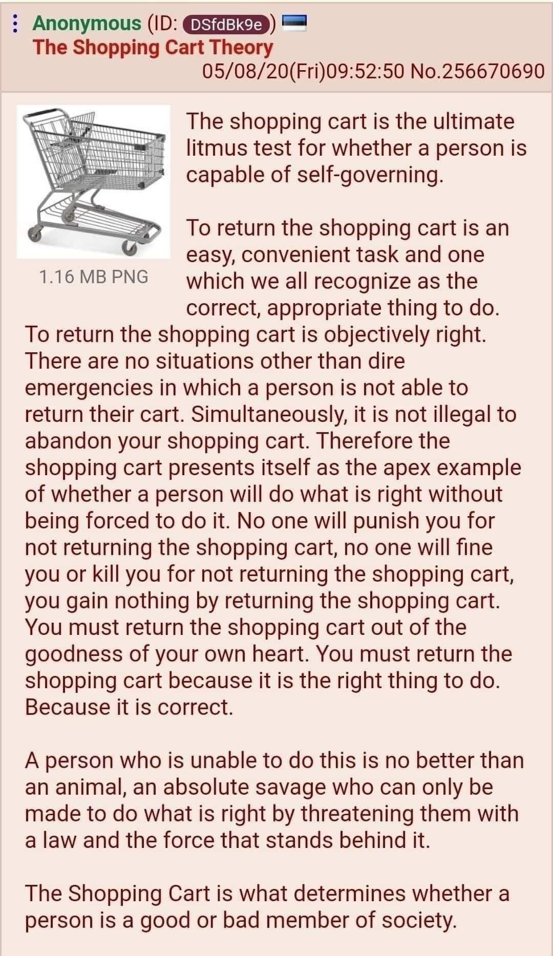 The Shopping Cart Problem 2020-05-16 ethics, society, self governance, shopping, shopping cart theory, trolley problem, thought experiment The Shopping Cart Problem