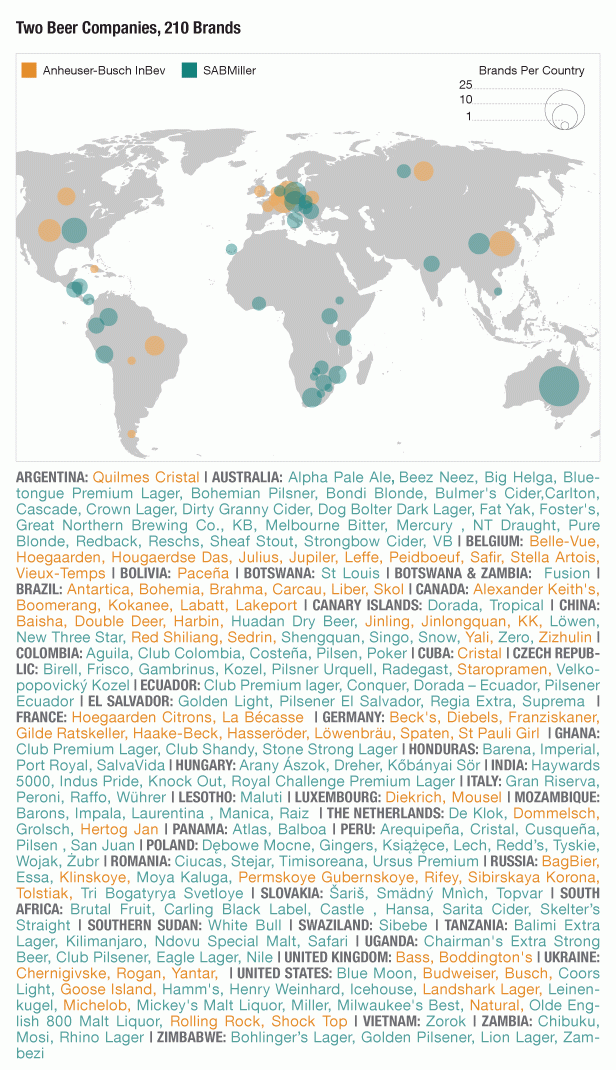 Map shows all 210 beer brands owned by AB InBev and SABMiller in 2013 #jupiler #leffe #stella #Piedboeuf