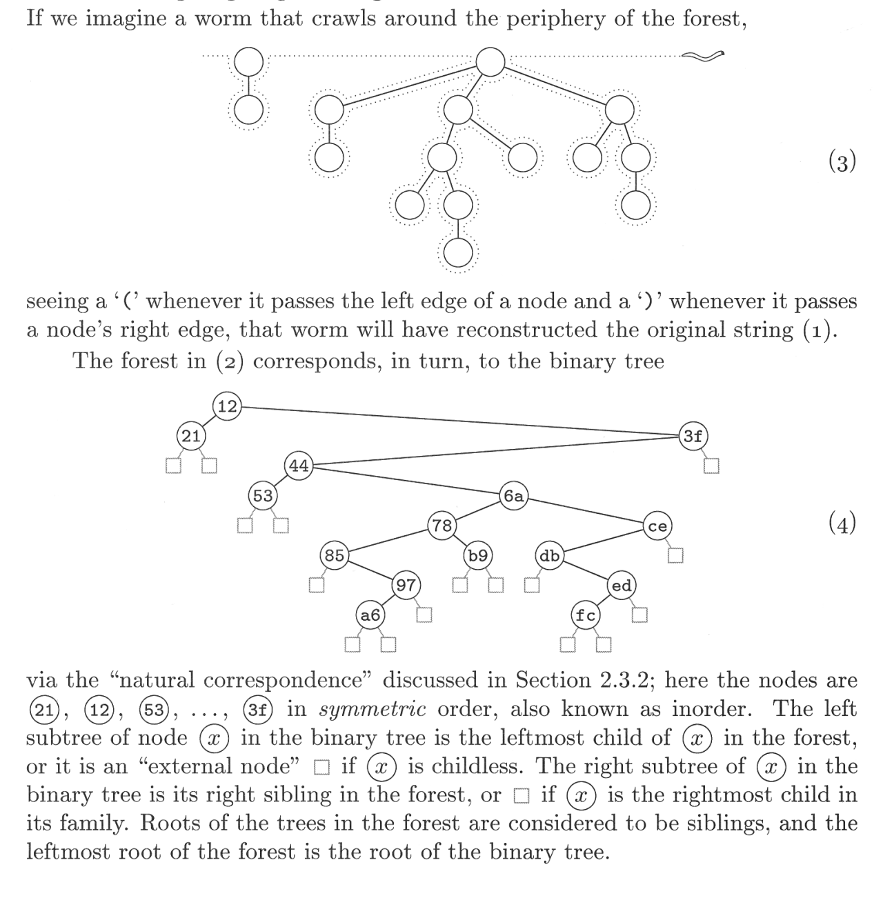 “If we imagine a worm that crawls around the periphery of the forest, seeing a ‘(’ whenever it passes the left edge of a node and a ‘)’ whenever it passes a node’s right edge, that worm will have reconstructed the original string“