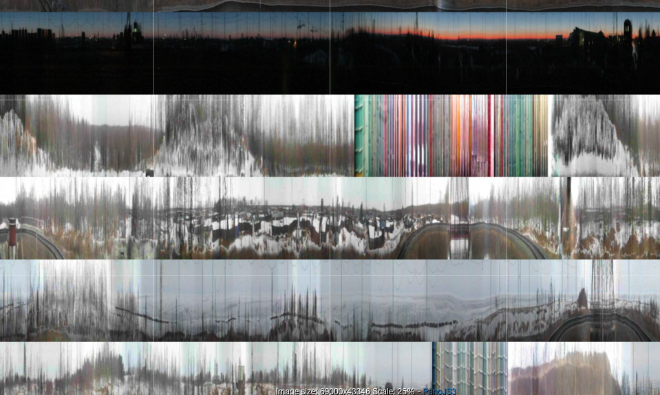 What you see is over 200GB of footage, shrunk into a single image using a technique known as slitscan. Every frame, I take the middle column of pixels and concatenate it to the image. Each vertical column of pixels represents 1/30th of a second. This adds up into a huge strip, which is then cut and pasted into a more pleasing rectangle.