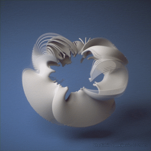 This simulation depicts a circular source of magnetic field line intersections generating a surface curling around in the presence of a complex solar magnetic field.