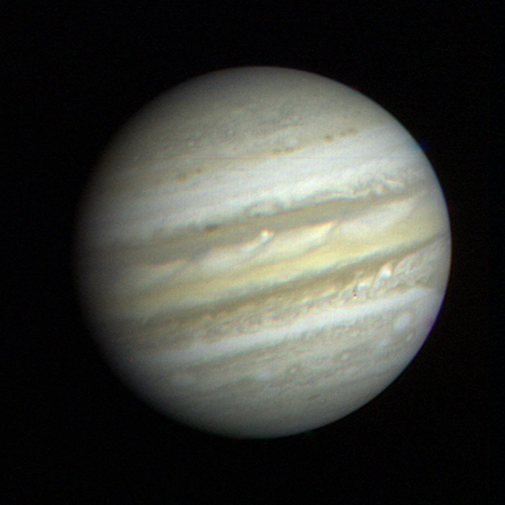 NASA’S Voyager 1 took this picture of the planet Jupiter on Saturday, Jan. 6, the first in its three-month-long, close-up investigation of the largest planet. The spacecraft, flying toward a March 5 closest approach, was 35.8 million miles (57.6 million kilometers) from Jupiter and 371.7 million miles (598.2 million kilometers) from Earth when the picture was taken. As the Voyager cameras begin their meteorological surveillance of Jupiter, they reveal a dynamic atmosphere with more convective structure than had previously been thought. While the smallest atmospheric features seen in this picture are still as large as 600 miles (1,000 kilometers) across, Voyager will be able to detect individual storm systems as small as 3 miles (5 kilometers) at closest approach. The Great Red Spot can be seen near the limb at the far right. Most of the other features are too small to be seen in terrestrial telescopes. This picture is really a combination of three images taken through color filters, then transmitted to Jet Propulsion Laboratory through the Deep Space Network’s antennas, and assembled by JPL’s Image Processing Lab. The Voyager Project is managed for NASA by Caltech’s Jet Propulsion Laboratory.