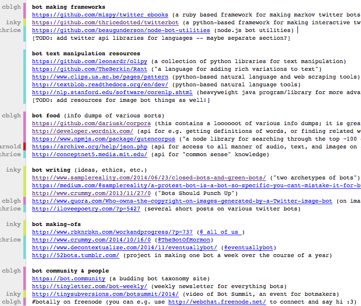 Bot resources is a really useful list of links to code, APIs and ideas for making bots. I found this on the also very informative Bot Weekly newsletter delivered by Beaugunderson. The rapidly growing community of botmakers is so prolific that these weekly updates tend to include ten or more new bots, mostly twitter bots though. I have a feeling that in 2015 this community will experiment more beyond twitter.