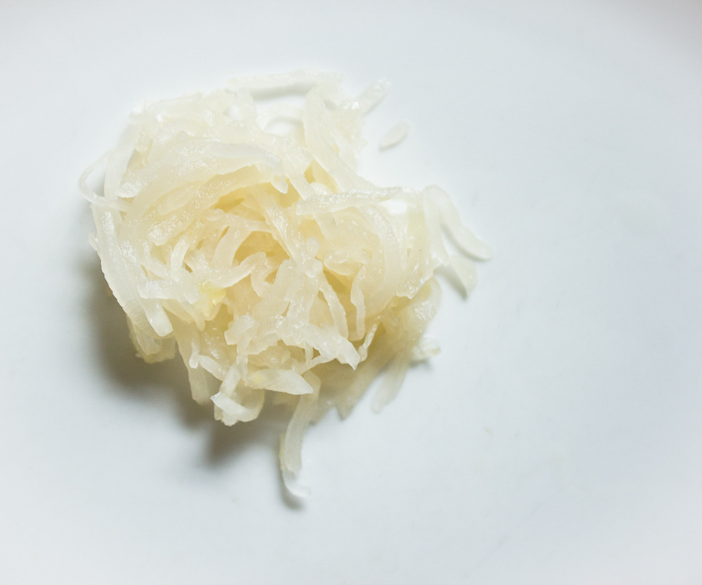 My favourite thing to ferment, which has gone through five different versions since summer 2012. This is the best so far. I shredded turnips, mixed them with 1.5% salt, left them to macerate for an hour, then added 150g live yoghurt whey and 80g raw turnip juice. They have been in since 16th March, and are getting better and better. Spicy and savoury and electric with lactic acid.
