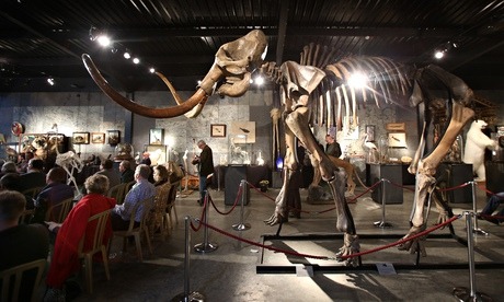 It stands 3.5 metres tall and is 5.5 metres long (11ft tall by 18ft long), suggesting it may have been a male that weighed up to six tonnes. The skeleton, which is 30,000 to 50,000 years old, was estimated to command a price of between £150,000 and £250,000. It had been in a private eastern European collection for years and was only assembled, including tusks, for the first time when it came to the auction house. Errol Fuller, the curator of the sale, said: “Although mammoth are not as rare as some dinosaur skeletons, the chances to buy an almost complete skeleton don’t come up very often. We had interest from private buyers as well as institutions from around the world and there was bidding going on between buyers in the sale room and on the phones.” The lot was offered at the auction house’s second Evolution sale, where a giant egg from the extinct elephant bird was also offered. A Chinese museum was the successful bidder paying £69,960 for the egg, which is more than 30cm in length. It had been expected to fetch between £30,000 and £50,000. Elephant birds were akin to giant ostriches and were native to Madagascar. They have been extinct since at least the 17th century. At the first Evolution sale, in November last year, a diplodocus skeleton named Misty sold for £400,000. It was originally bought anonymously, but the Obel Family Foundation later revealed that it was the purchaser and was donating the skeleton to the Natural History Museum of Denmark, in Copenhagen. (via Woolly mammoth skeleton fetches £189,000 at auction | World news | The Guardian)
