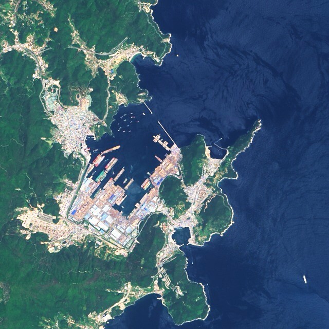 The largest ships in the world are built on Geoje Island, South Korea. This May, Landsat 8 had a clear view of Daewoo Shipbuilding & Marine Engineering, better known as DSME. It’s one of three world-class shipyards in the country. One of the others, Samsung Heavy Industries, is a 40-minute bus ride away on the other side of the island. DSME has the contract to build the Maersk Triple-E ships, which are 400 m (a quarter of a mile) long and can carry more than 18,000 standard shipping containers. When empty, they weigh as much as the Titanic did fully loaded. Even their propellers are so large that the metal takes a week to cool after casting. Their size allows them to be more efficient and more environmentally friendly than typical cargo ships. Three are visible at docks here, with their sterns (back sections) painted red. This image is about 9 km (6 mi) on each side. (via http://instagram.com/p/ugl_21TeRY/)