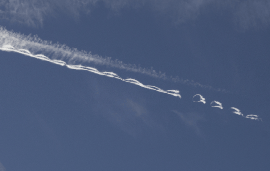 Watching airplane contrails overhead, you may have noticed them transform into a daisy chain of distorted rings. This is an effect known as the Crow instability. The contrails themselves are the airplane’s wingtip vortices, made visible by water vapor condensed out of the engine exhaust. These two initially parallel vortex lines spin in opposite directions. A slight crosswind can disturb the initially straight lines, causing them to become wavy. This waviness increases over time until the vortex lines almost touch. Then the vortices pinch off and reconnect into a line of vortex rings that slowly dissipate. Be sure to check out the full-resolution version of this animation for maximum effect. (Image credit: J. Hertzberg, source)