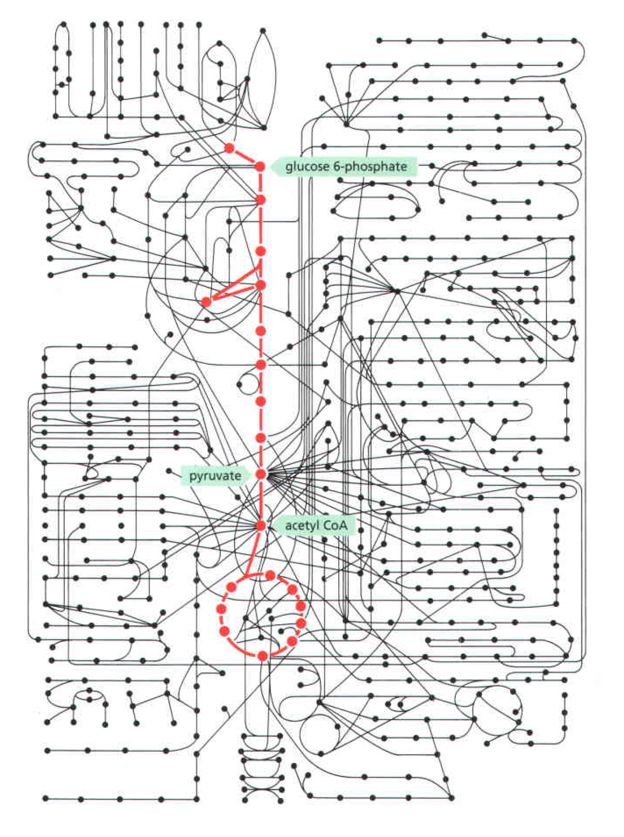 Some 500 metabolic reactions of a typical cell are shown schematically with the reactions of glycolysis and the citric acid cycle in red. Other reactions either lead into these two central pathways-delivering small molecules to be catabolized with production of energy-or they lead outward and thereby supply carbon compounds for the purpose of biosynthesis.