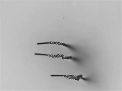 Shown above are a trio of microscale rockets, each about 10 microns in length. These tiny rockets are roughly cylindrical in shape, with a narrower diameter at the front than the back. Like their space-faring brethren, these microrockets are chemically propelled. They draw in fuel from their surroundings, which reacts with the catalysts coating the interior of the microrocket to produce gases. Those gases bubble out the back end of the microrocket, creating thrust capable of propelling the rockets more than 1000 body lengths/second. Researchers have already demonstrated that these tiny rockets can haul cargo along with them. Scientists hope one day to use these self-propelled microrockets to help deliver drugs or isolate cancer cells. (Image credit: J. Li et al., source)