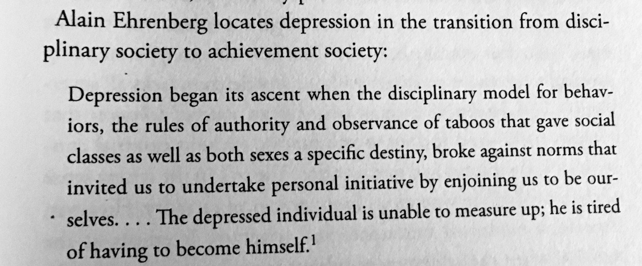 This claim that we are depressed because we are “tired of becoming ourselves” seems like a rebuke to the “never being, always becoming” school of liberation. But it’s more a rejection of the “self as brand equity” position. It suggests how the capitalist demand to always be productive, or, if you prefer, the neoliberal expectation that we will convert our lives into capital that must always be systematically grown, seizes upon the ideal of self-expression and strips it of its dignity.