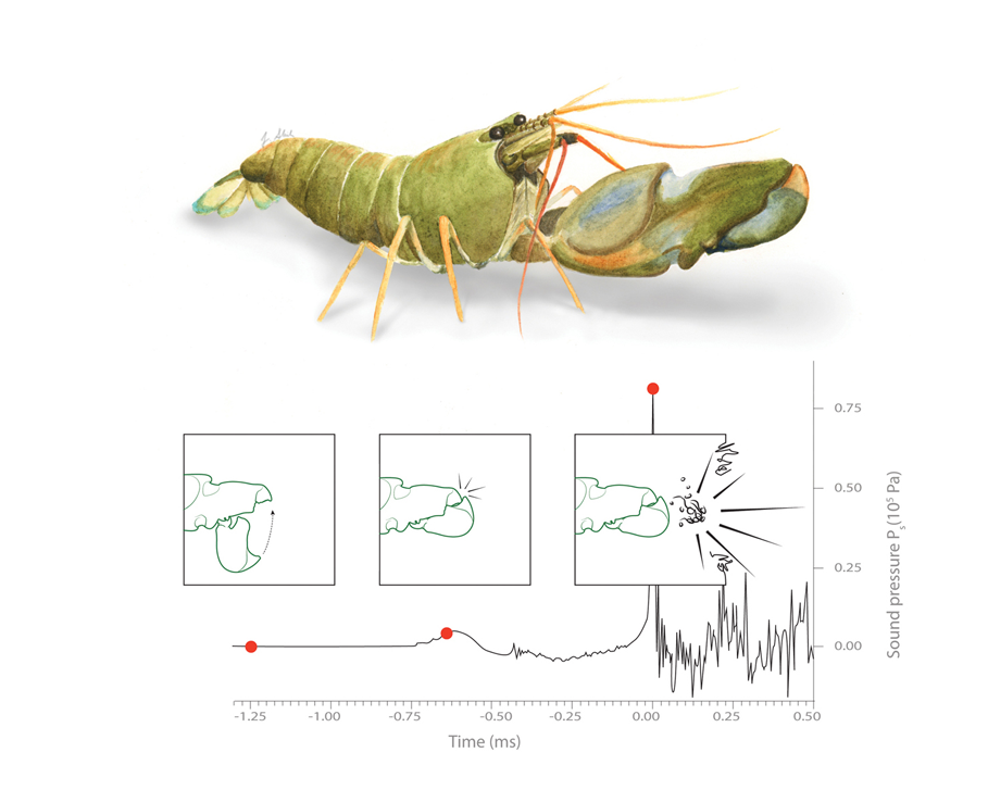 Pistol shrimp, or snapping shrimp, have a disproportionately large claw from where it derives its name. As a defense mechanism and for hunting, when the claw closes with a quick snap, it emits a bubble. This bubble, upon bursting, causes an extremely powerful sound wave (sonic boom!) which can kill small fish and stun larger ones.