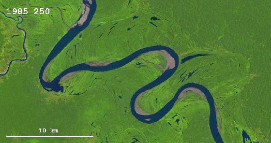 Thanks to the Landsat program and Google Earth Engine, it is possible now to explore how the surface of the Earth has been changing through the last thirty years or so. Besides the obvious issues of interest, like changes in vegetation, the spread of cities, and the melting of glaciers, it is also possible to look at how rivers change their courses through time. You have probably already seen the images of the migrating Ucayali River in Peru, for example here. This river is changing its course with an impressive speed; many – probably most – other rivers don’t show much obvious change during the same 30-year period. What determines the meander migration rate of rivers is an interesting question in fluvial geomorphology.