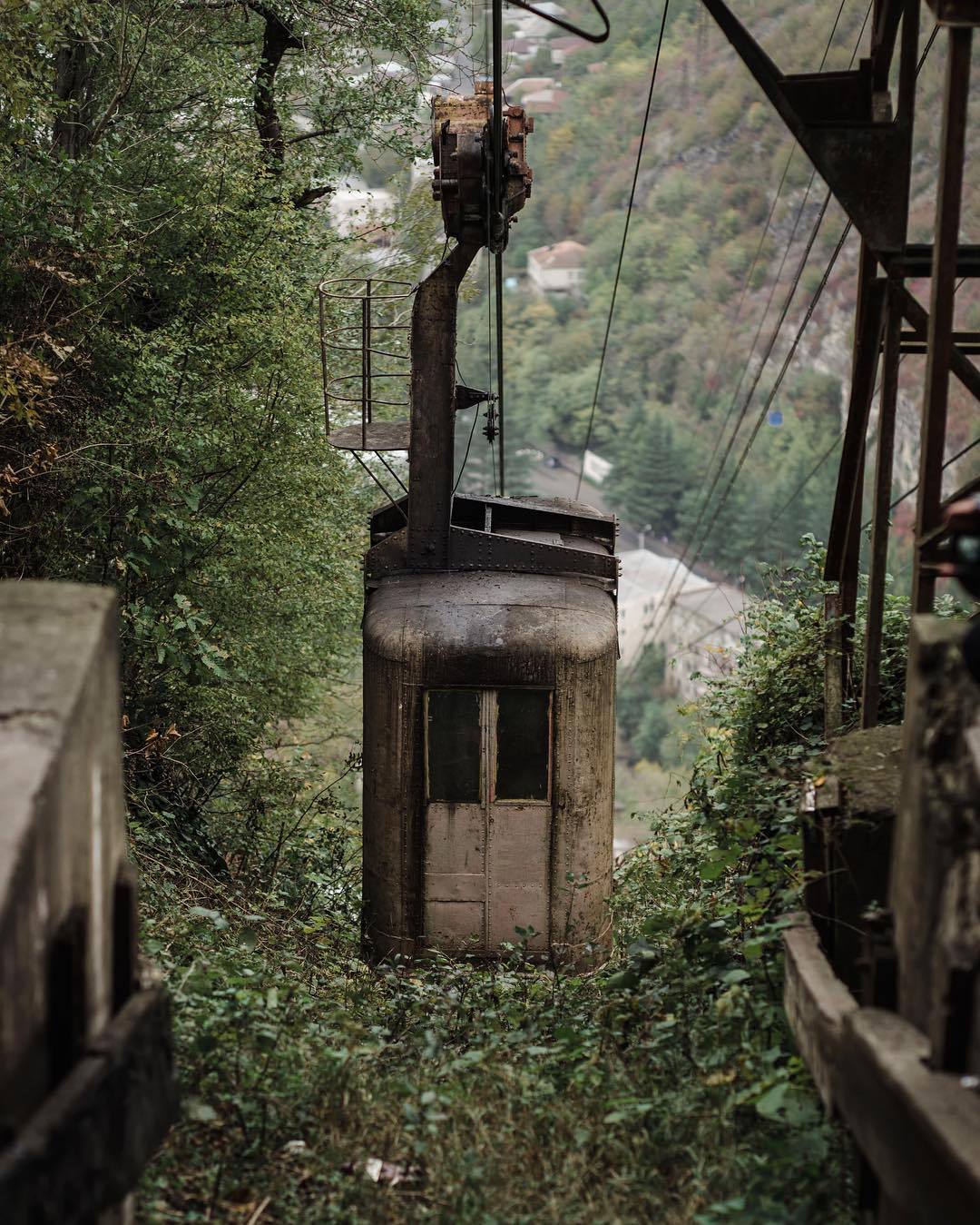 With an estimated 239 tonnes of mineable ore available in the region, the USSR’s insatiable desire for natural resources quickly transformed the economy of the ancient city. However, a decline in the value of manganese, crossed with a bolshevik seizure of mining property and foreign divestment in operations, ushered the unintended decline of production at the mine, which had only a decade earlier provided more than half the world’s manganese ore. The divestiture of the mine caused officials to renege on plans to build infrastructure that would have modernized the mine and the lives of its workers. Miners continued to spend much of their days winding their way up and down steep, 80 degree cliffs, working excessive hours and in miserable conditions, until in 1954, shortly after Stalin’s death, city planners took to the sky to solve the issue of transportation. Almost miraculously, and without the use of heavy equipment, they constructed the intricate cable car system that would become a unique feature of Chiatura, transporting miners and citizens between the city and the mines above. Sixty-one years later, the system is still in operation and free to ride.(5/7 Soviet Swing) by misterzvereff (via https://www.instagram.com/p/BB5LV40IjbZ/)