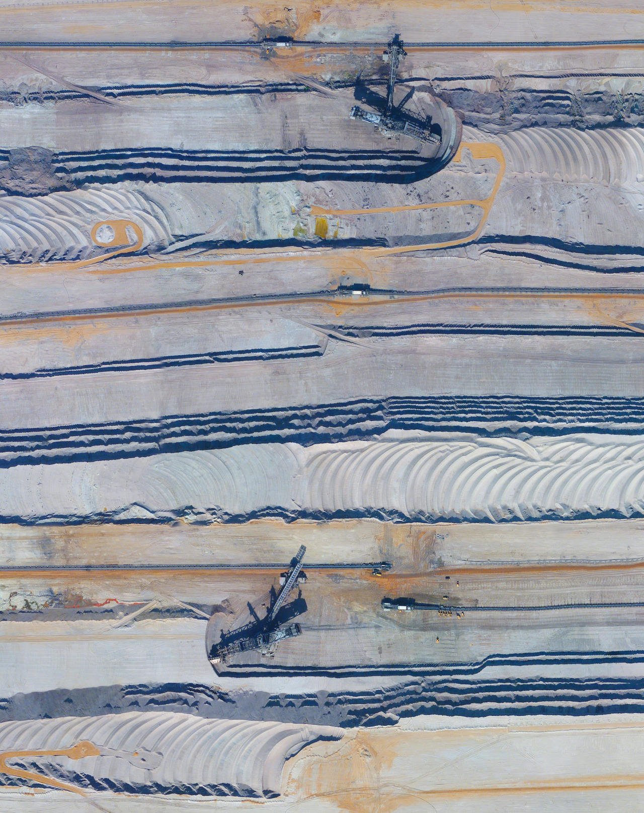 Bucket-wheel excavators run on tracks at the Tagebau Hambach open-pit mine in Niederzier and Elsdorf, Germany. These massive machines (up to 315 feet tall and 730 feet long) continuously scoop materials from the surface in order to extract lignite. Lignite, often referred to as “brown coal”, is a soft combustible sedimentary rock that is formed from naturally compressed peat and is used as a fuel for steam-electric power generation.