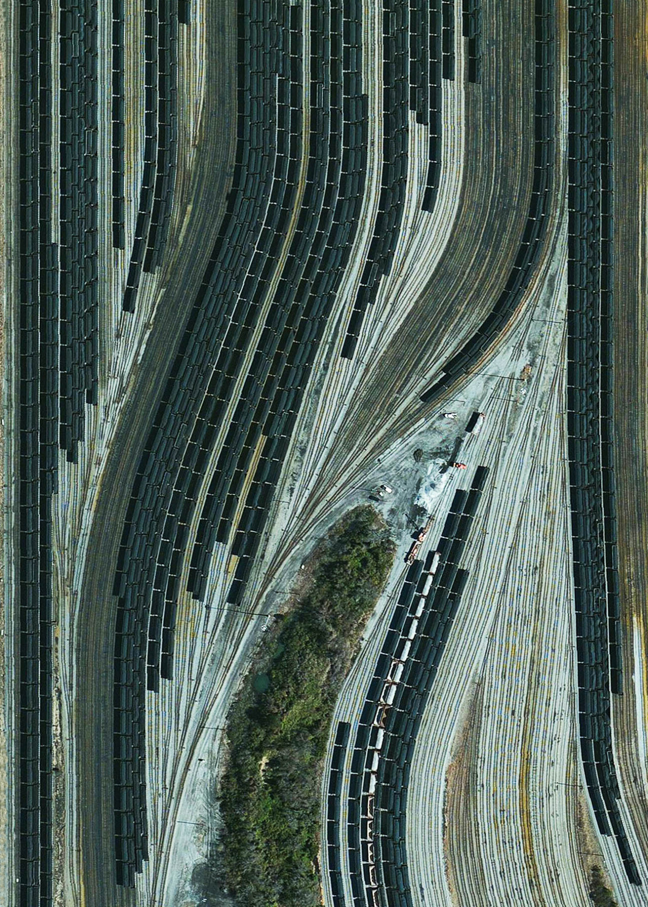 Train cars filled with coal are stationed in Norfolk, Virginia. Operated by the Norfolk Southern corporation, Lamberts Point Pier 6 is the largest coal-loading station in the Northern Hemisphere and serves at the temporary depot for the company’s fleet of 23,000 coal cars.
