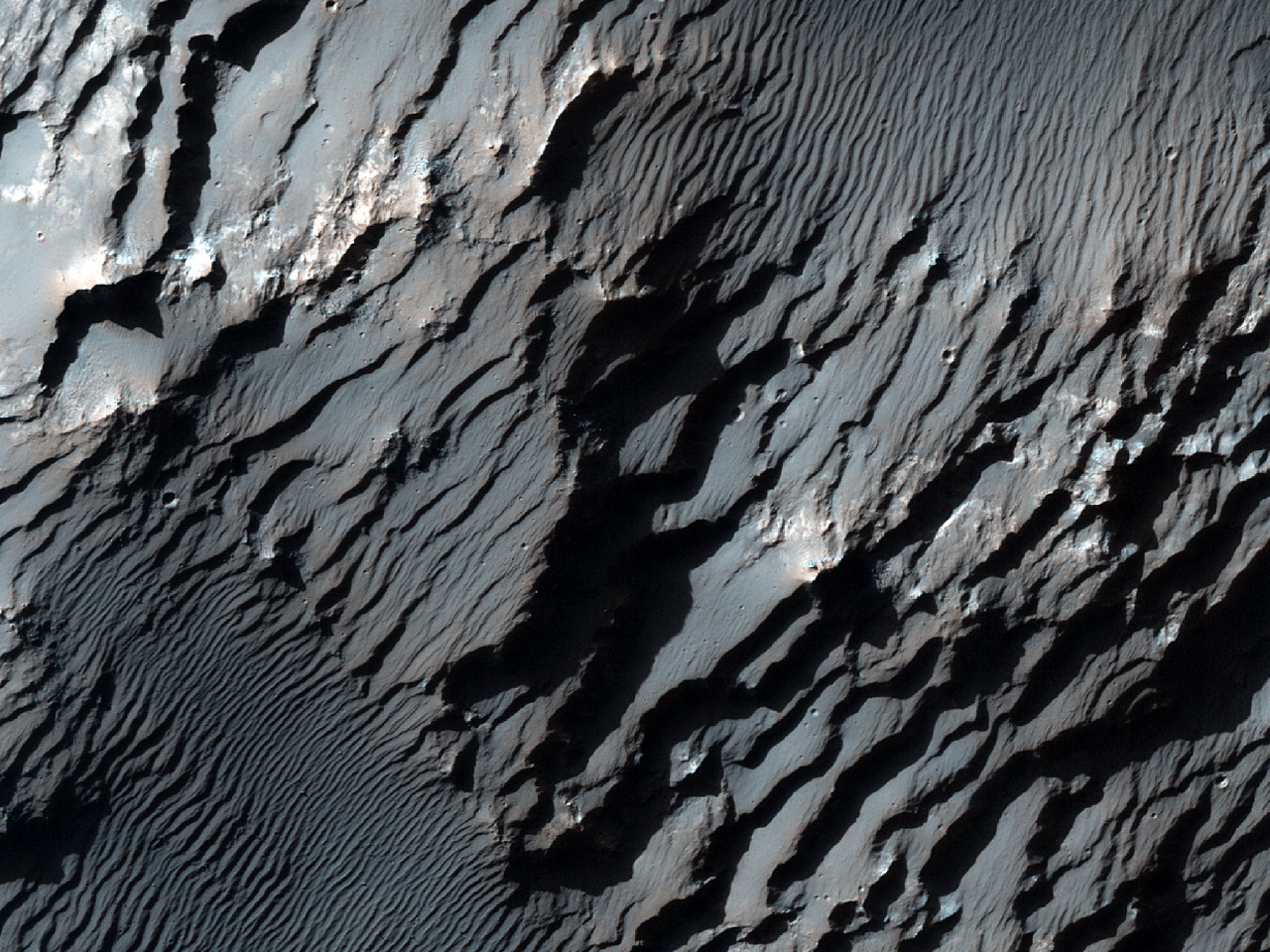 Blue evaporation ponds are visible at the Intrepid Potash Mine in Moab, Utah, USA. The mine produces muriate of potash, a potassium-containing salt used widely by farmers in fertilizer. The salt is pumped to the surface from underground brines and dried in massive solar ponds that vibrantly extend across the landscape. As the water evaporates over the course of 300 days, the salts crystallize out. So why are you seeing such vibrant colors? The water is dyed bright blue to reduce the amount of time it takes for the potash to crystallize; darker water absorbs more sunlight and heat.