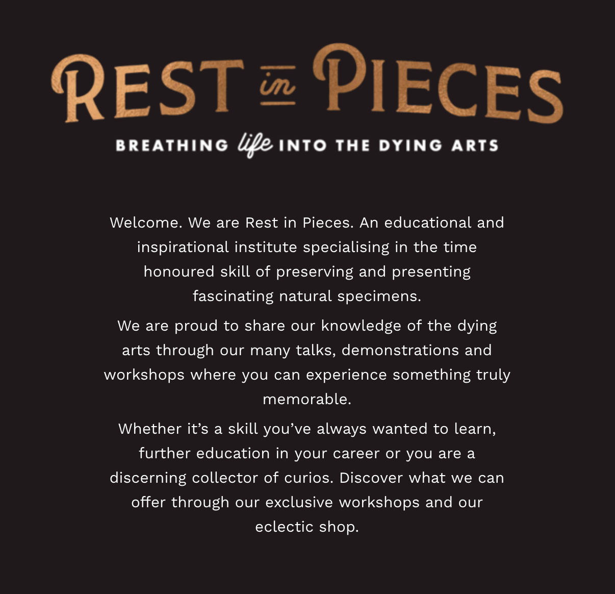 We are Rest In Pieces. An educational and inspirational institute specialising in the time honoured skill of preserving and presenting fascinating natural specimens.