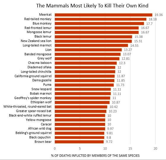 Gómez’s study is the first thorough survey of violence in the mammal world, collating data on more than a thousand species. It clearly shows that we humans are not alone in our capacity to kill each other. Our closest relatives, the chimpanzees, have been known to wage brutal war, but even apparently peaceful creatures take each other’s lives. When ranked according to their rates of lethal violence, ground squirrels, wild horses, gazelle, and deer all feature in the top 50. So do long-tailed chinchillas, which kill each other more frequently than tigers and bears do.