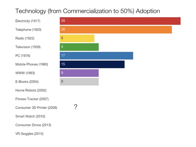 “There often are competing claims as to who invented a technology and when, for example, and there are early prototypes that may or may not “count.” James Clerk Maxwell did publish A Treatise on Electricity and Magnetism in 1873. Alexander Graham Bell made his famous telephone call to his assistant in 1876. Guglielmo Marconi did file his patent for radio in 1897. John Logie Baird demonstrated a working television system in 1926. The MITS Altair 8800, an early personal computer that came as a kit you had to assemble, was released in 1975. But Martin Cooper, a Motorola exec, made the first mobile telephone call in 1973, not 1983. And the Internet? The first ARPANET link was established between UCLA and the Stanford Research Institute in 1969. The Internet was not invented in 1991. […] Economic historians who are interested in these sorts of comparisons of technologies and their effects typically set the threshold at 50% – that is, how long does it take after a technology is commercialized (not simply “invented”) for half the population to adopt it. This way, you’re not only looking at the economic behaviors of the wealthy, the early-adopters, the city-dwellers, and so on (but to be clear, you are still looking at a particular demographic – the privileged half.)”