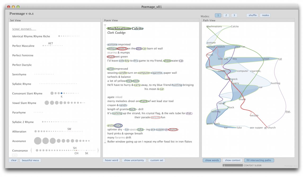 Poemage is a visualization system for exploring the sonic topology of a poem. We define sonic topology as the complex structures formed via the interaction of sonic patterns — words connected through some sonic or linguistic resemblance — across the space of the poem. Poemage was developed at the University of Utah as part of an ongoing, highly exploratory collaboration between data visualization experts and poets/poetry scholars.